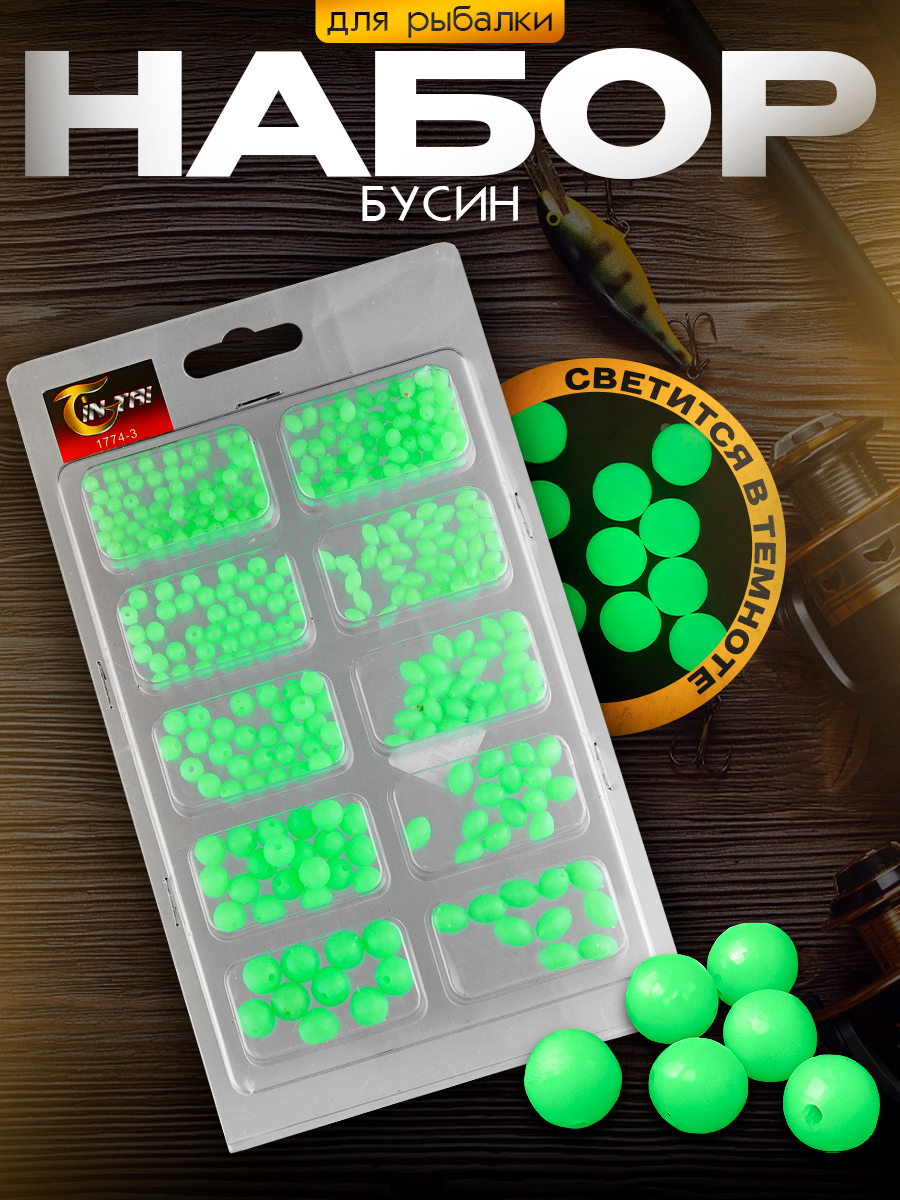 Набор бусин (10 размеров) фотолюминесцентных, зеленых