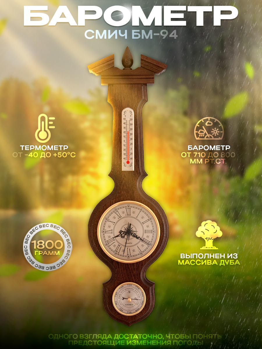 Корпус изготовлен из качественной древесины, чтобы долгие годы защищать механизмы часов, термометра и барометра.