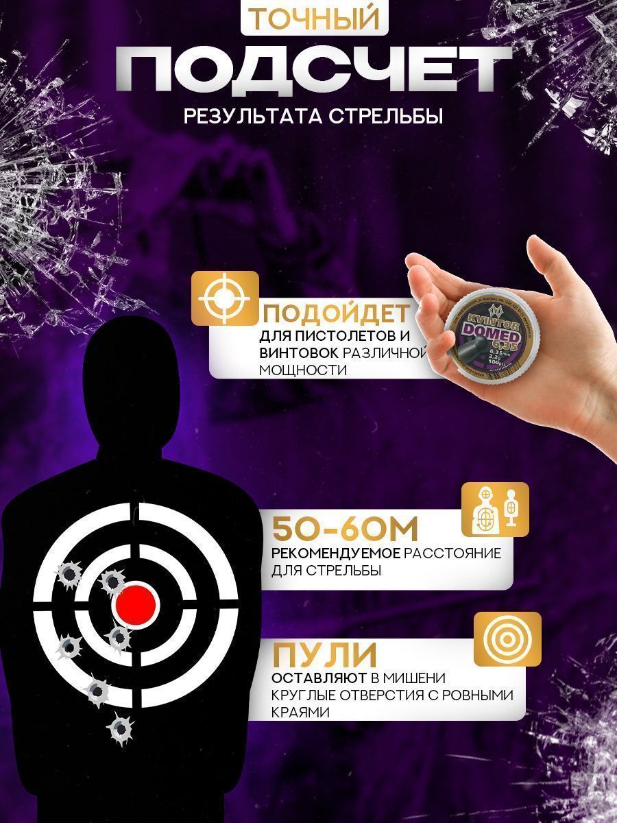 Пули Kvintor Domed 6,35 являются продолжением серии круглоголовых пуль производимых нашей компанией. Данная форма пули самая востребованная из всех имеющихся в линейке Квинтор. Пули Kvintor Domed 6,35 mm проявили отличные стрелковые показатели на дистанции в 50-60 метров. Благодаря круглой головной части существенно снижается сопротивление воздуха при полёте пули. Проникающая способность пуль Квинтор Домед средняя.