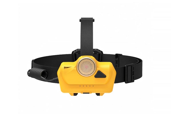 Наклонный корпус (45°). Регулируемое крепление на голову (упругая лента). Регулировка яркости вращающейся ручкой. Встроенное зарядное устройство от microUSB. Индикатор уровня заряда батарей. Выдвижная пластина для предотвращения ослепления встречных. Отдельный батарейный отсек.