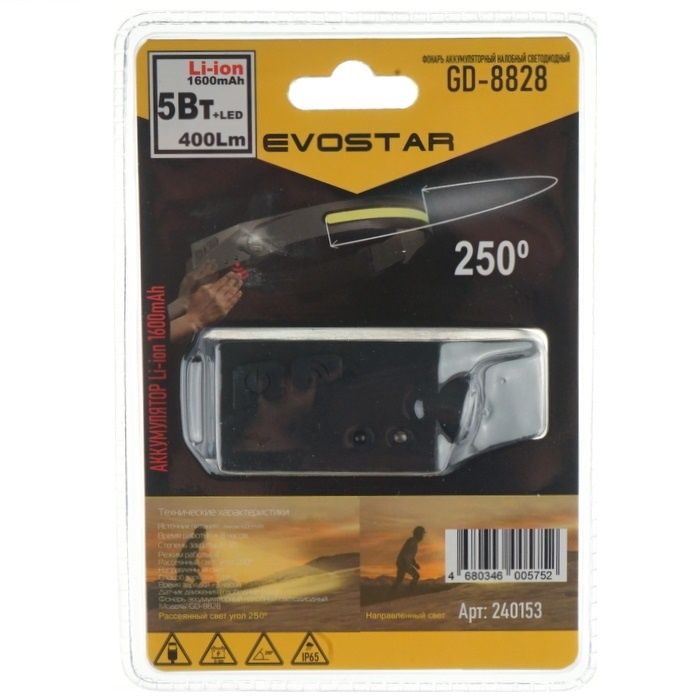 Фонарь налобный Evostar GD8828 на аккум. (400Лм, Li-Ion 1600mAh, светод. 5Вт+COB, IP65, датчик движения, 4 режима)