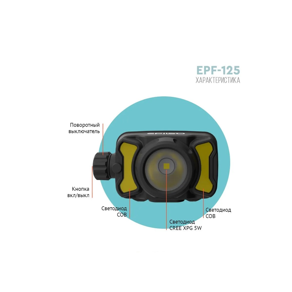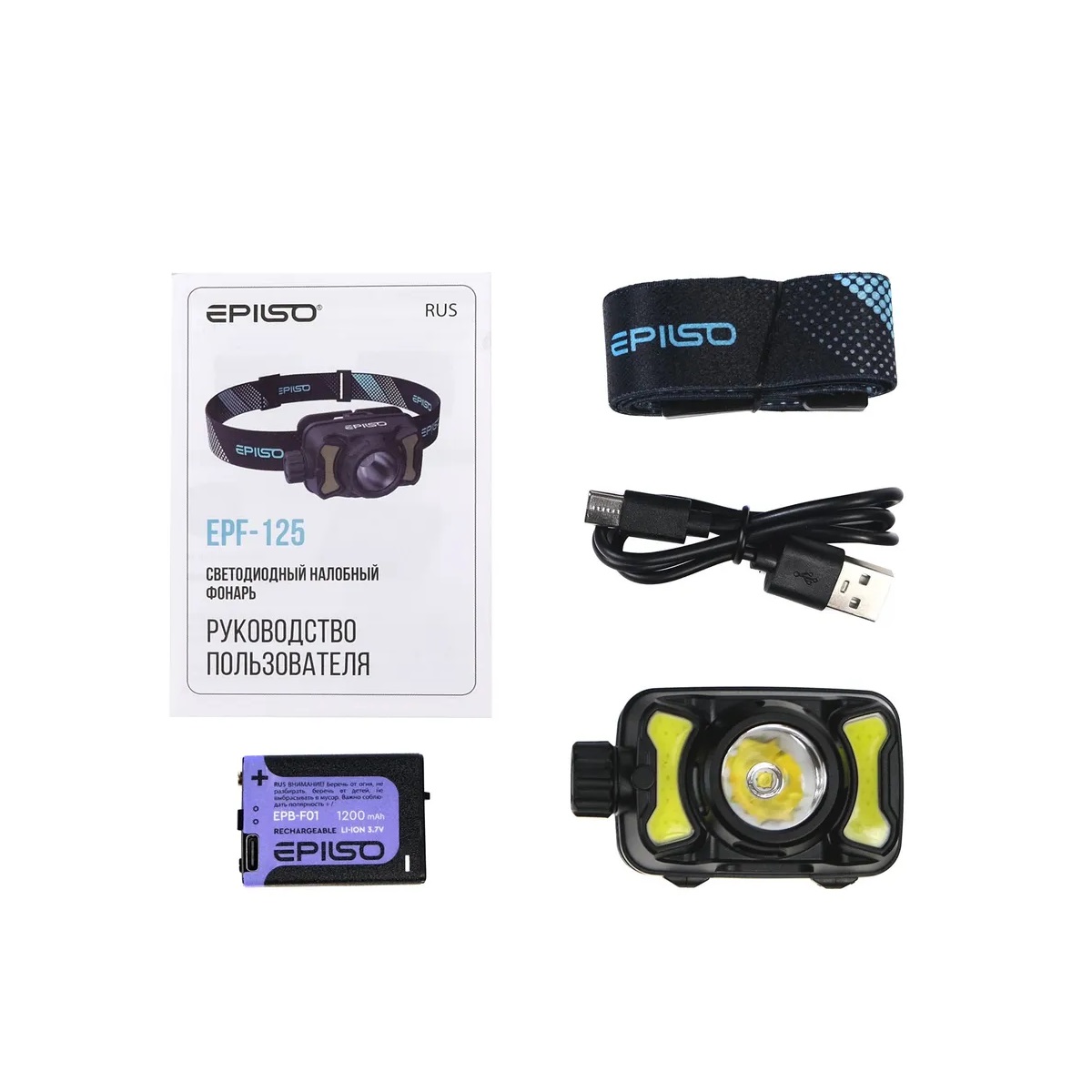 Фонарь налобный Epilso EPF-125 (CREE XPG 5W+COBx2, 1x1200mAh, 5В (USB), пластик, работа от ААА)