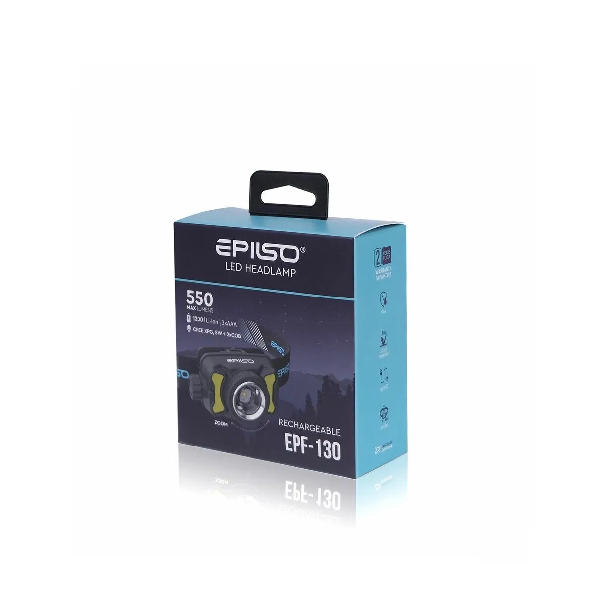 Фонарь налобный Epilso EPF-130 (CREE XPG 5W+COBx2, 1x1200mAh, 5В (USB), пластик, работа от ААА)