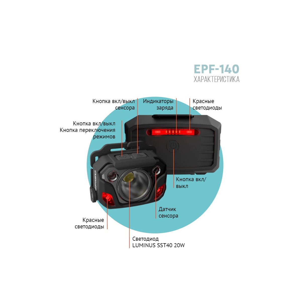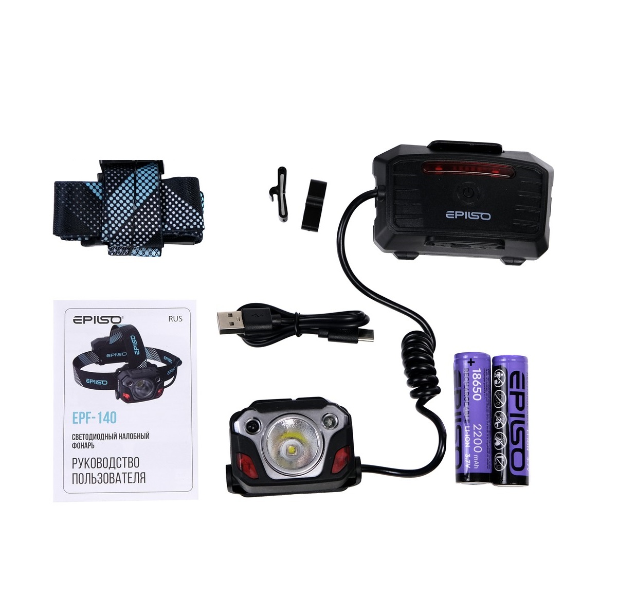 Фонарь налобный Epilso EPF-140 (Luminus SST40, 20W, 2x2200mAh, 5В (USB), пластик, аккум. 18650)