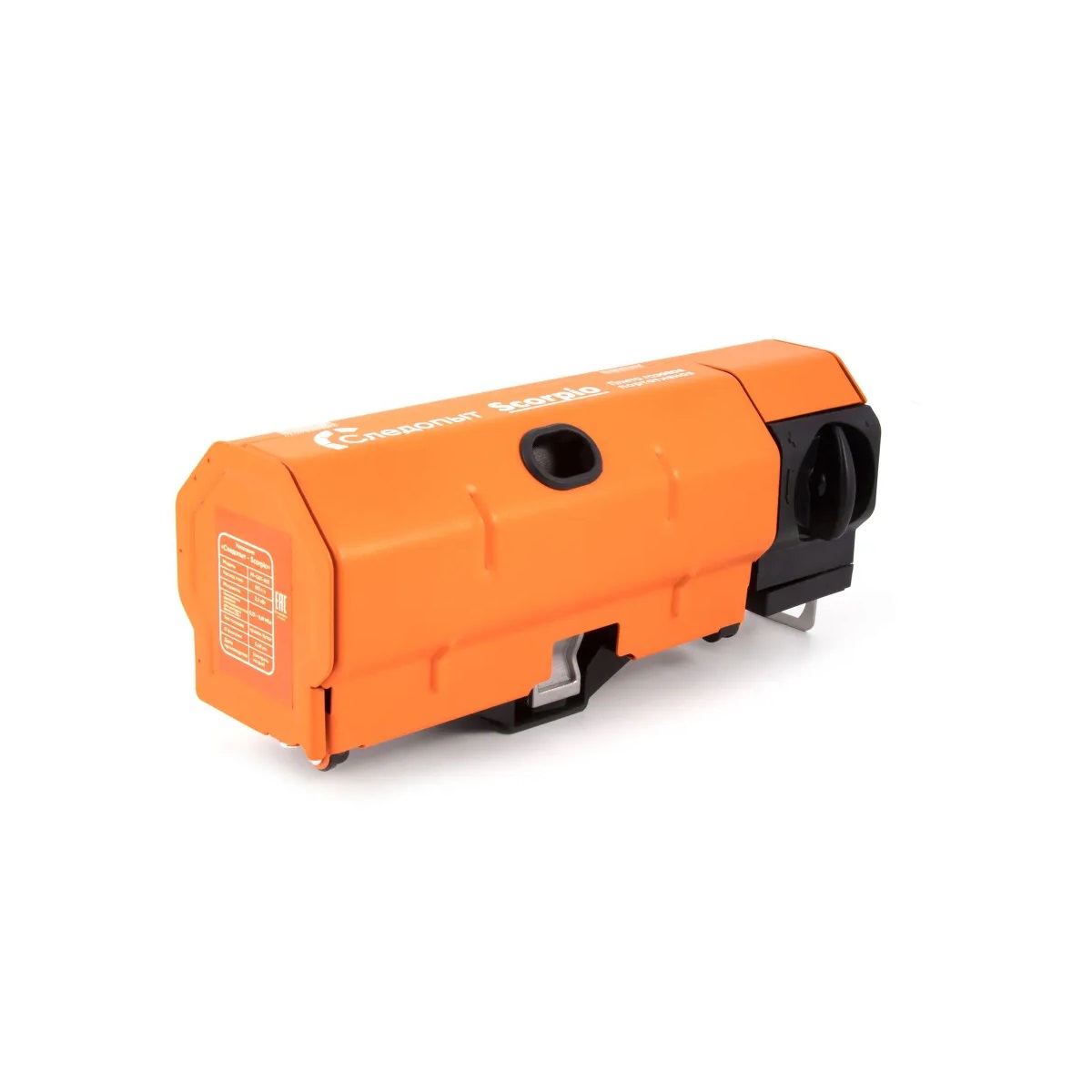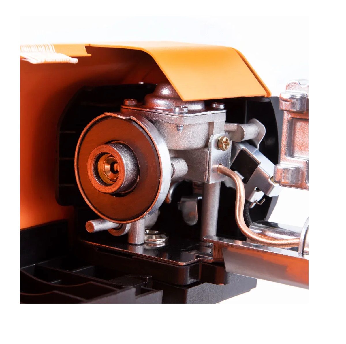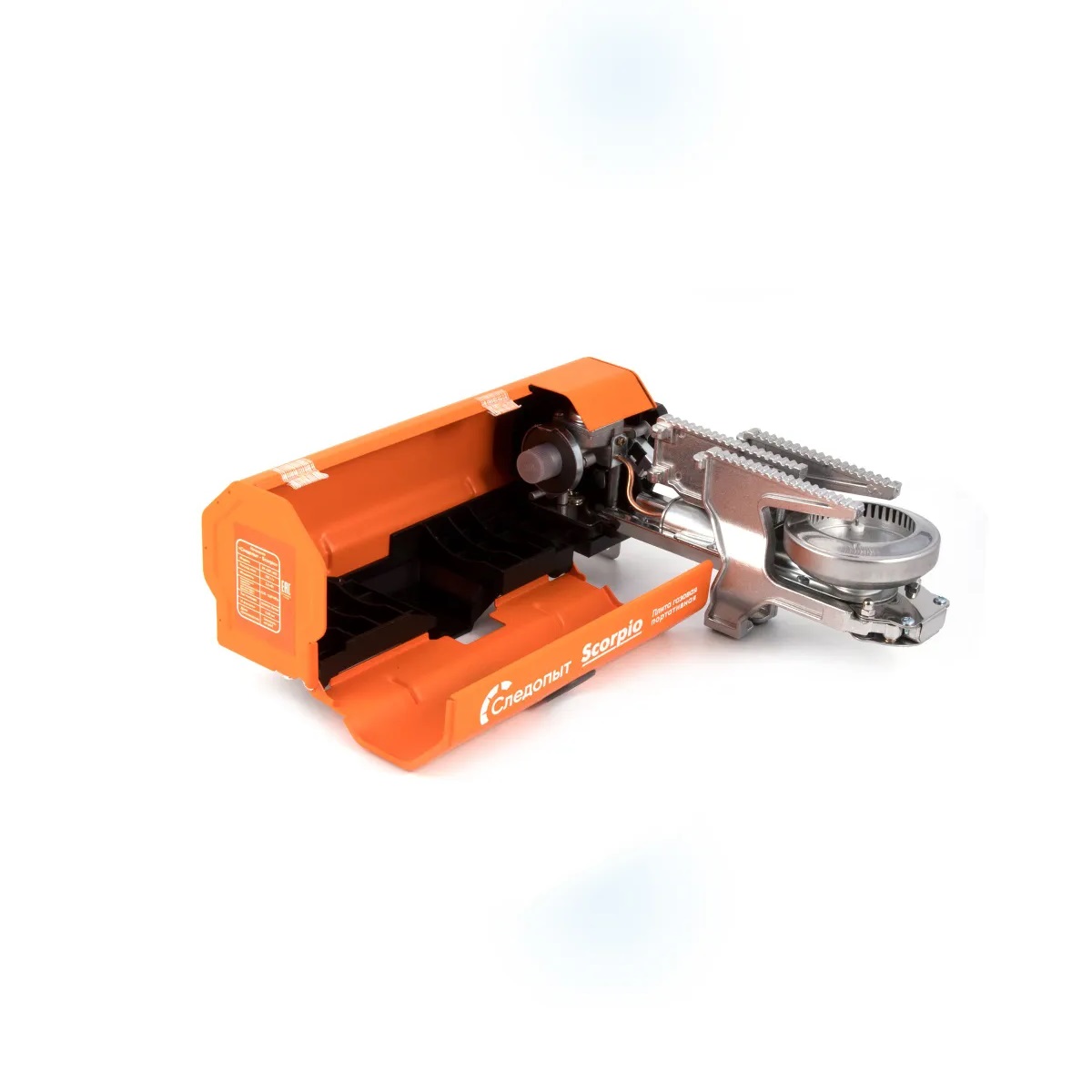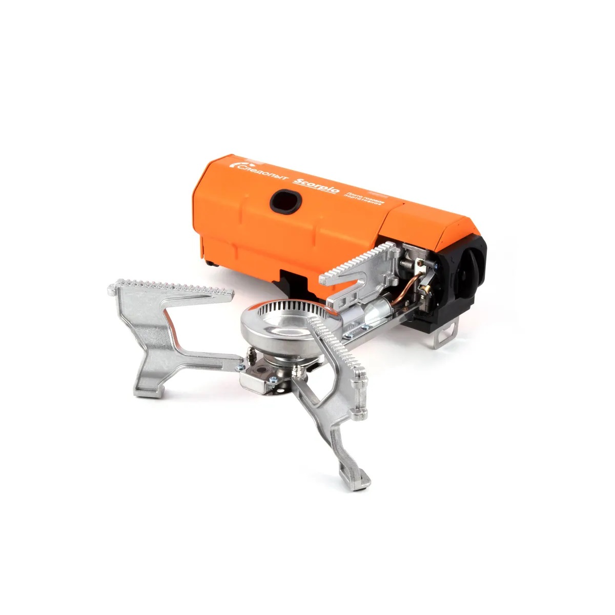 Плита оборудована одной горелкой с кольцевым образованием пламени, системой пьезоэлектрического розжига, блоком управления подачей газа и системой контроля избыточного давления. Для удобства транспортировки и хранения плита в собранном состоянии помещается в металлический корпус плиты вместо газового баллона. Топливо - газовые смеси PF-FG-220 (220 г) в баллонах с нажимным клапаном и цанговым захватом. Система магнитной фиксации позволяет легко присоединить баллон. Отверстие редуктора закрыто защитным пластиковым колпачком.
