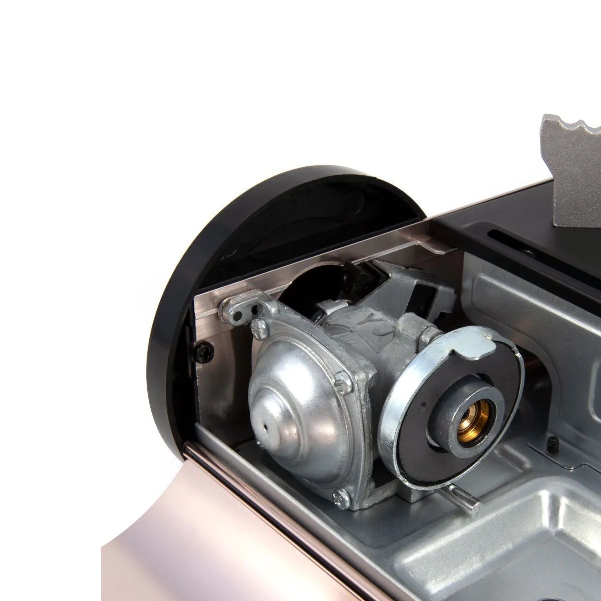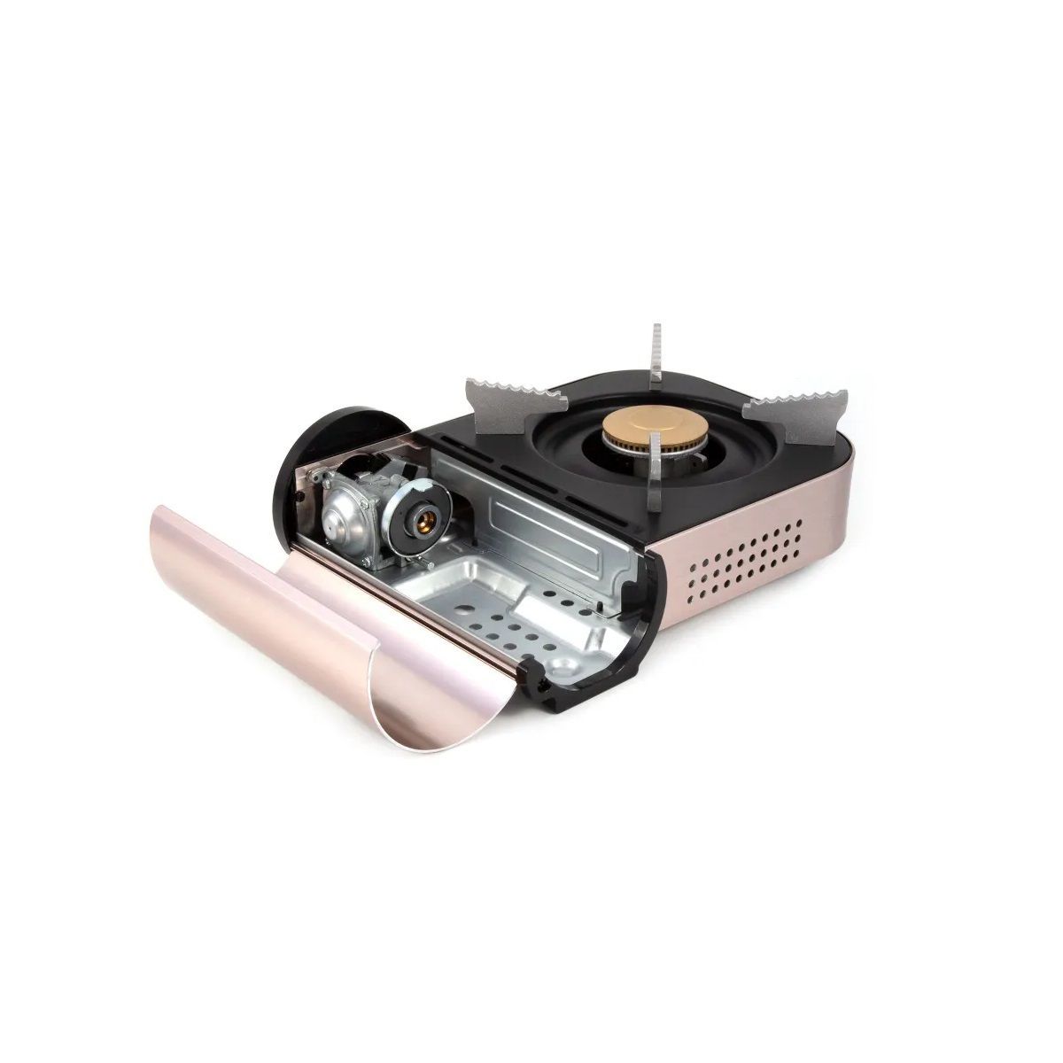 Плита оборудована одной горелкой с кольцевым образованием пламени, системой пьезоэлектрического розжига, блоком управления подачей газа и системой контроля избыточного давления. Топливо - газовые смеси PF-FG-220 (220 г) в баллонах с нажимным клапаном и цанговым захватом. Система магнитной фиксации позволяет легко присоединить баллон. Отверстие редуктора закрыто защитным пластиковым колпачком.