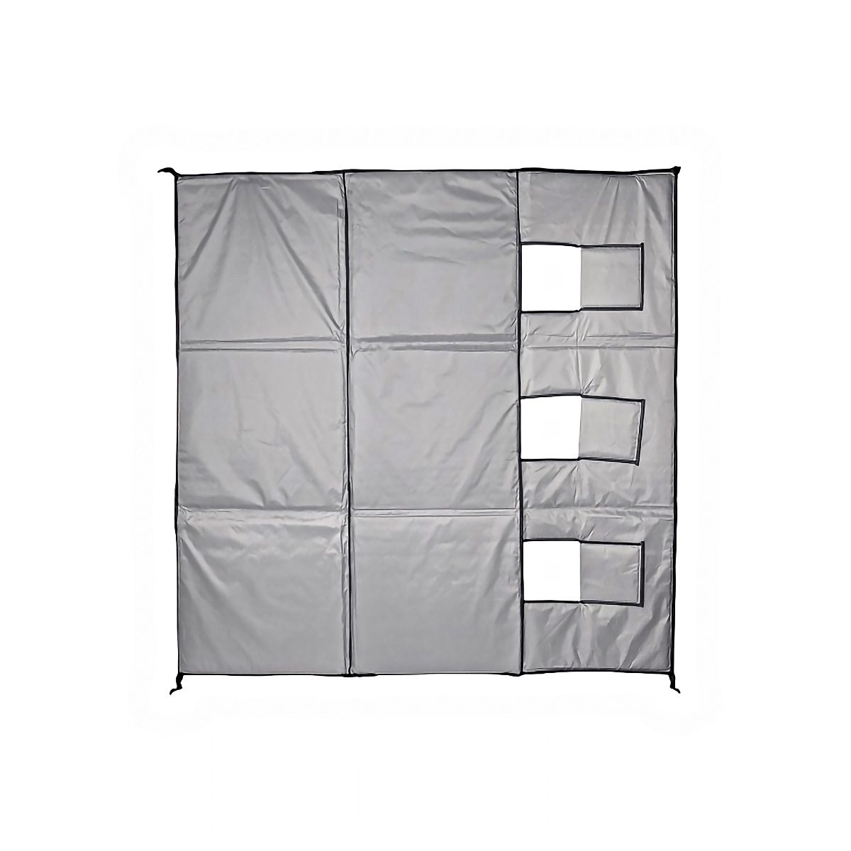 Практичность в деталях: прямоугольные отверстия под лунки закрываются клапанами на липучке для сохранения тепла, а на углах предусмотрены петли под ввертыши — пол фиксируется и не смещается при бурении или перемещении внутри палатки. Конструкция складывается компактно, удобна для перевозки и быстрой сушки после рыбалки.
