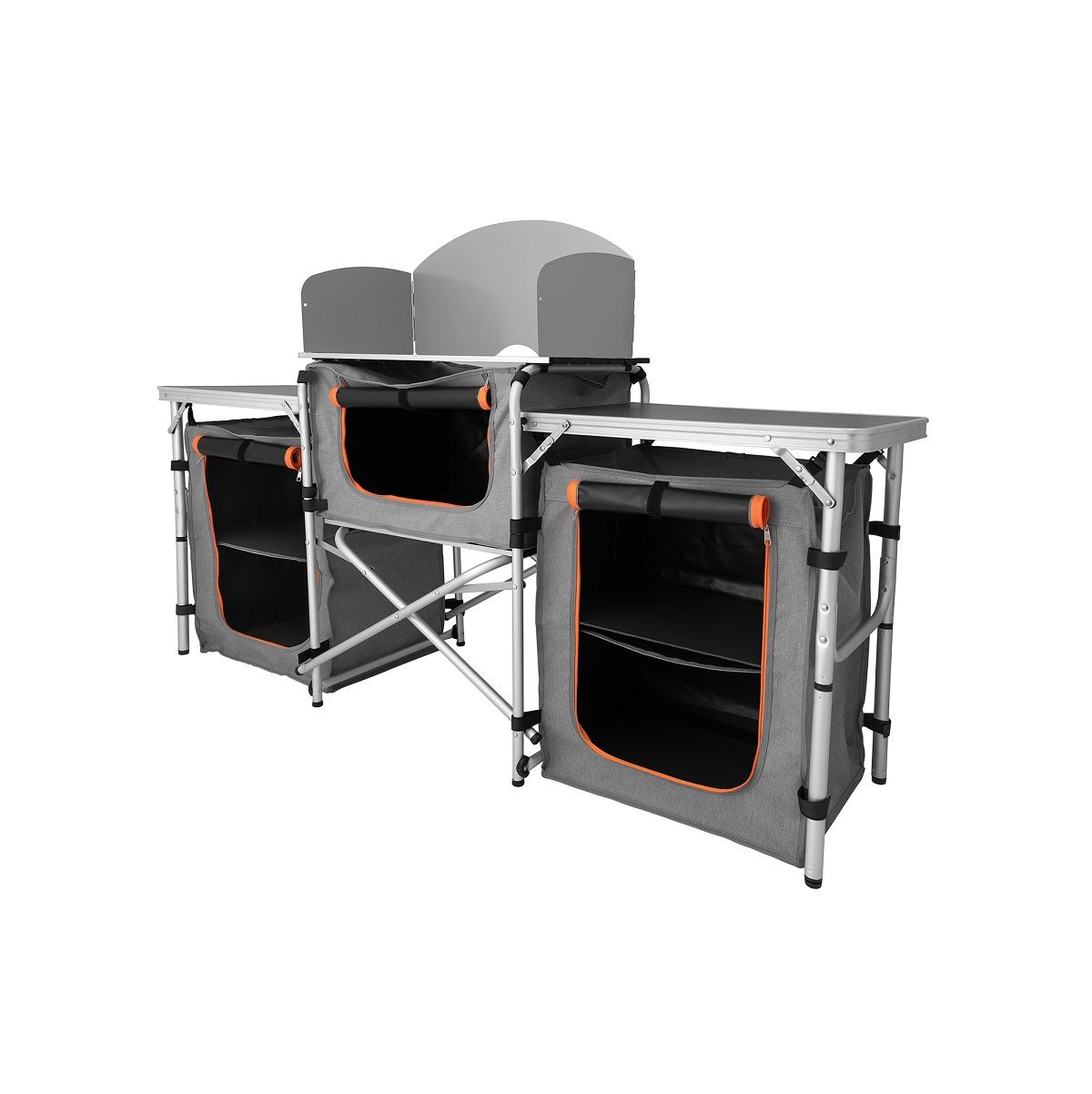 В отличие от базовых полевых столов и кухонь с одной секцией, здесь три рабочие зоны: центральная поверхность под плиту с экраном и две полноценные тумбы — это ускоряет процессы готовки и раскладки, а также экономит место в палатке или под навесом