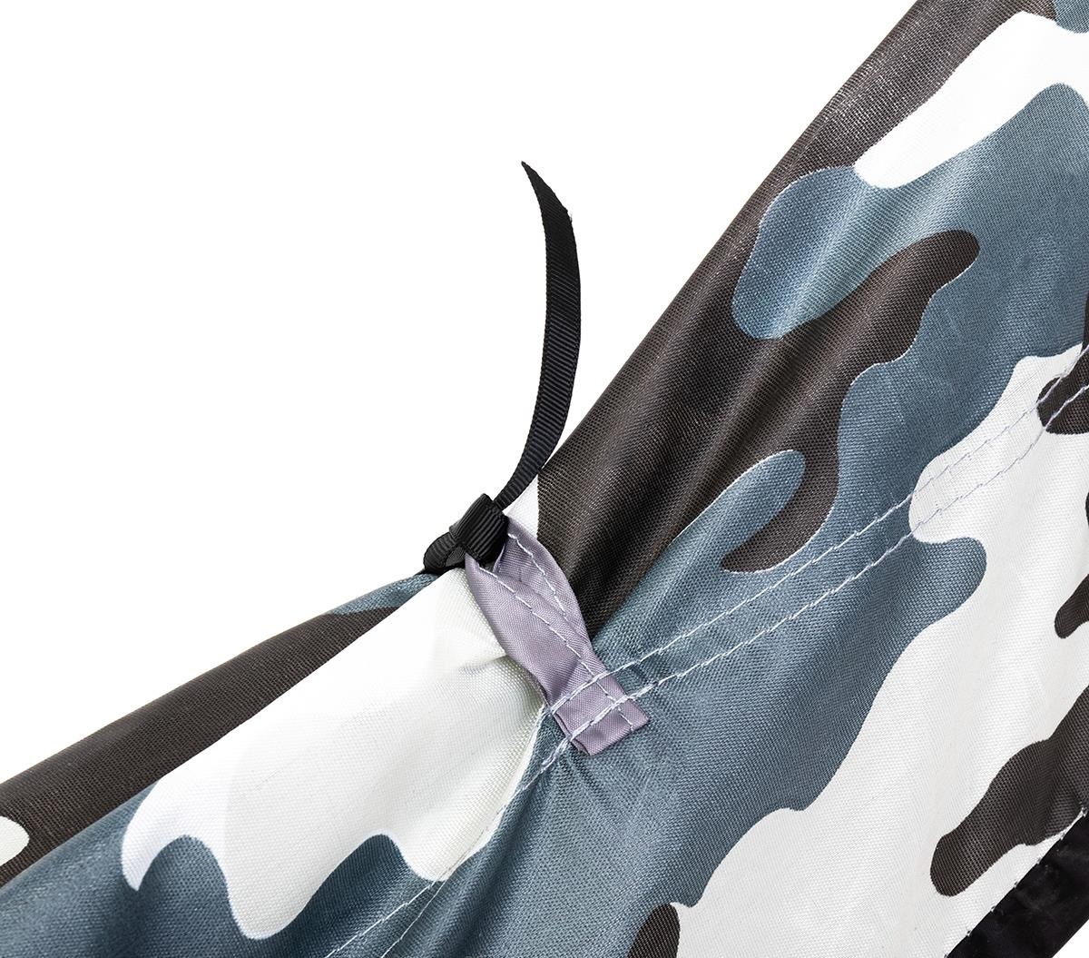 Тент палатки сшит из плотной ткани Oxford адаптированной к низкотемпературным режимам, характеризуется высокой прочностью и устойчивостью к влаге.