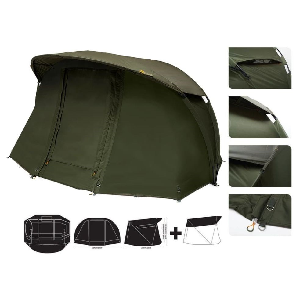 Прочный тент надёжно защищает от влаги и быстро крепится на липучки. Палатка выполнена из материала 210D с двойным покрытием, который сочетает лёгкость и исключительную прочность, предлагая водонепроницаемость до 10 000 мм. Вход оборудован окном из сетчатой ткани и двустворчатыми дверями на молниях, обеспечивая комфорт и удобство в любых погодных условиях.