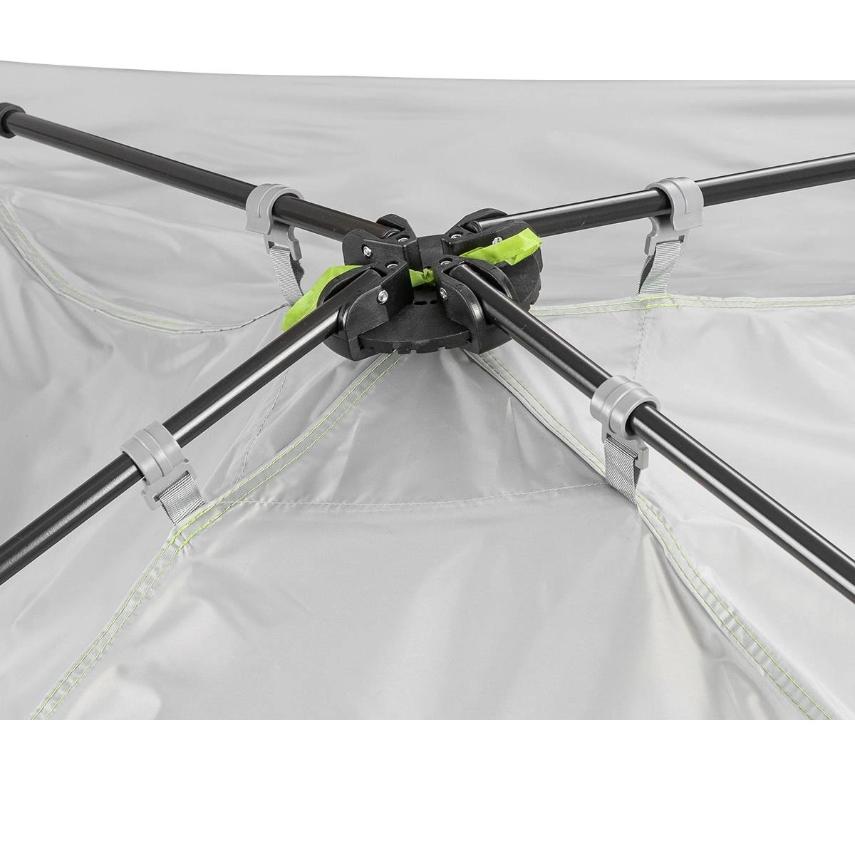 Специальная система позволяет устанавливать шатёр легко и быстро даже в одиночку. Достаточно вытащить сложенный шатёр из сумки-чехла (в комплекте), расправить его и разложить металлические телескопические стойки