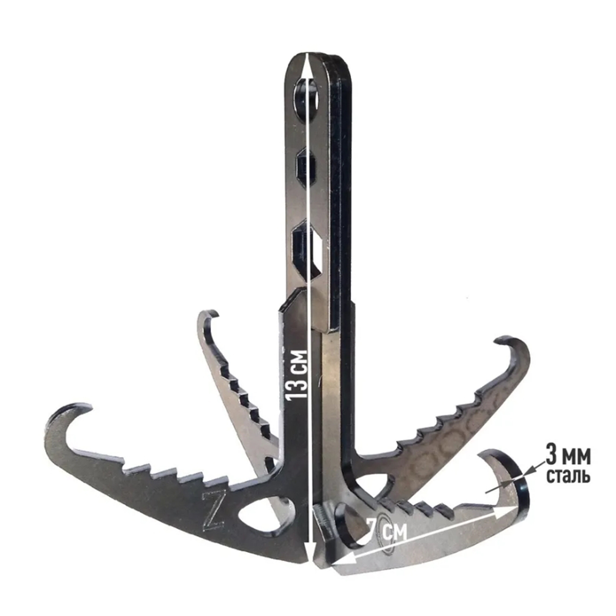 Компактная и лёгкая конструкция из стали Ст3 с четырьмя крюками быстро собирается из трёх элементов и так же быстро разбирается для переноски. Благодаря малому весу и плоскому форм-фактору в сложенном виде её удобно носить в подсумке или рюкзаке, а в работе она уверенно цепляется за кромки, ветви и элементы сооружений.