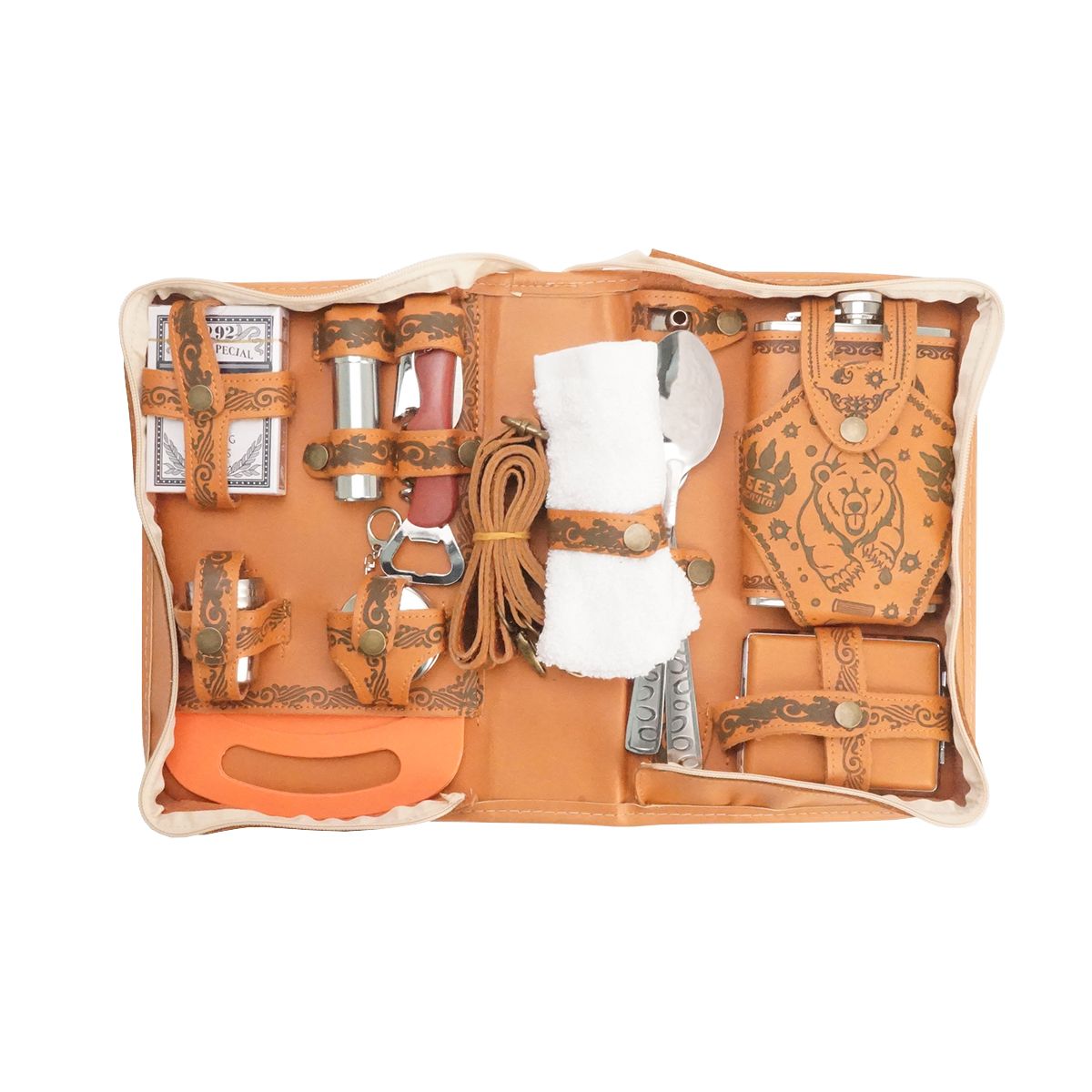 Набор Подарочный Helios Медведь бурый в сумке-чехле (фляжка+3 стопки+стакан+воронка+портсигар+вилка+ложка+полотенце) (HS-2023-PB-2)