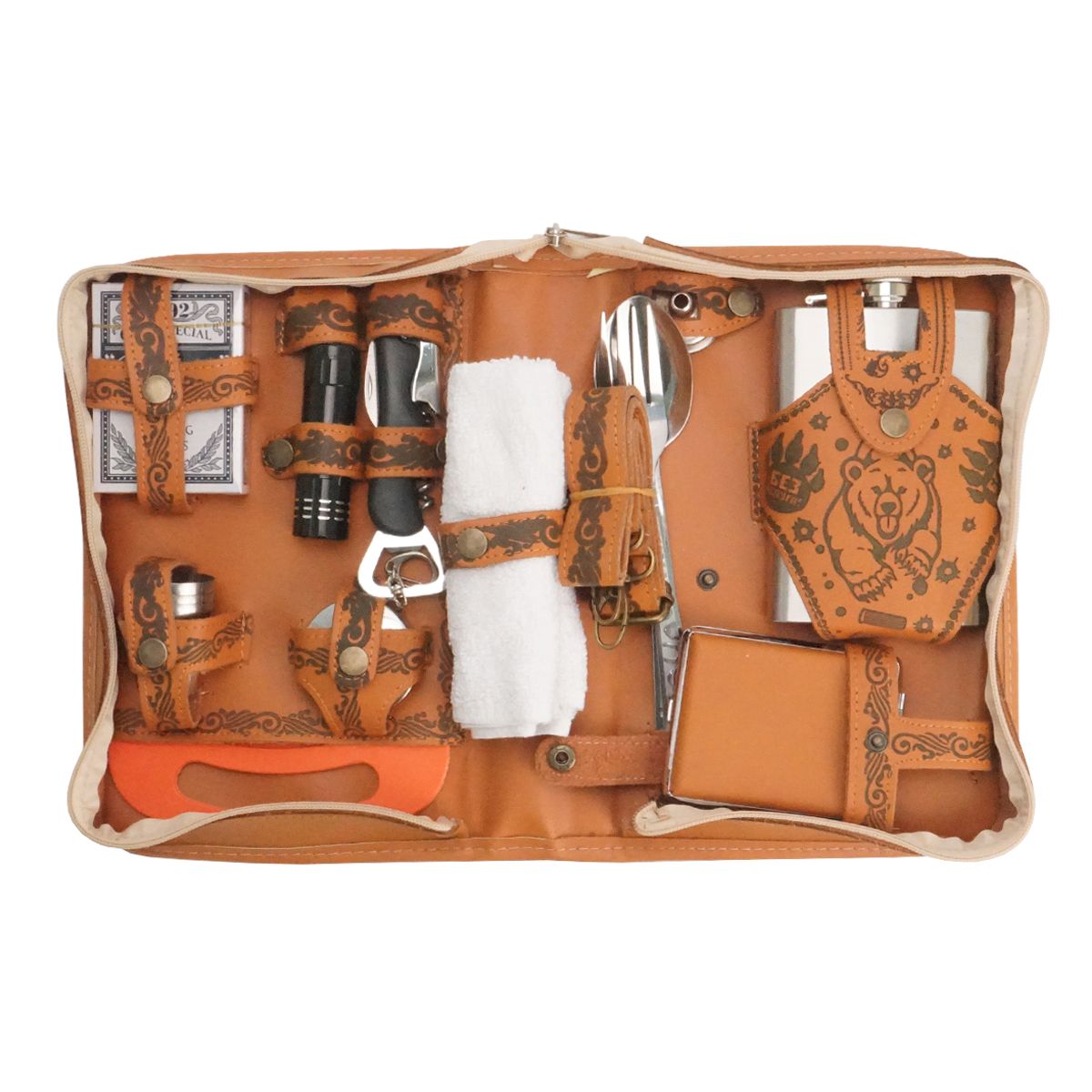 Набор Подарочный 9DBC в кожаном чехле (фляжка+3 стопки+стакан+воронка+портсигар+стол.приб.+полотенце+карты+фонарик+открывашка)