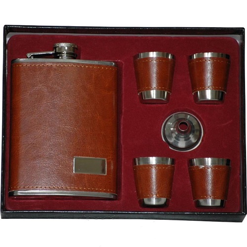 Фляжка и стопки изготовлены из нержавеющей стали и покрыты искусственной кожей.