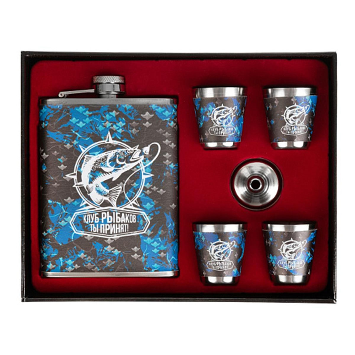 В подарочный набор "Клуб Рыбаков" входит: фляжка (240 мл) декорированная тисненым рисунком в виде рыбы, надписи, 4 стопки и воронка. Фляжка и стопки изготовлены из нержавеющей стали и покрыты искусственной кожей.