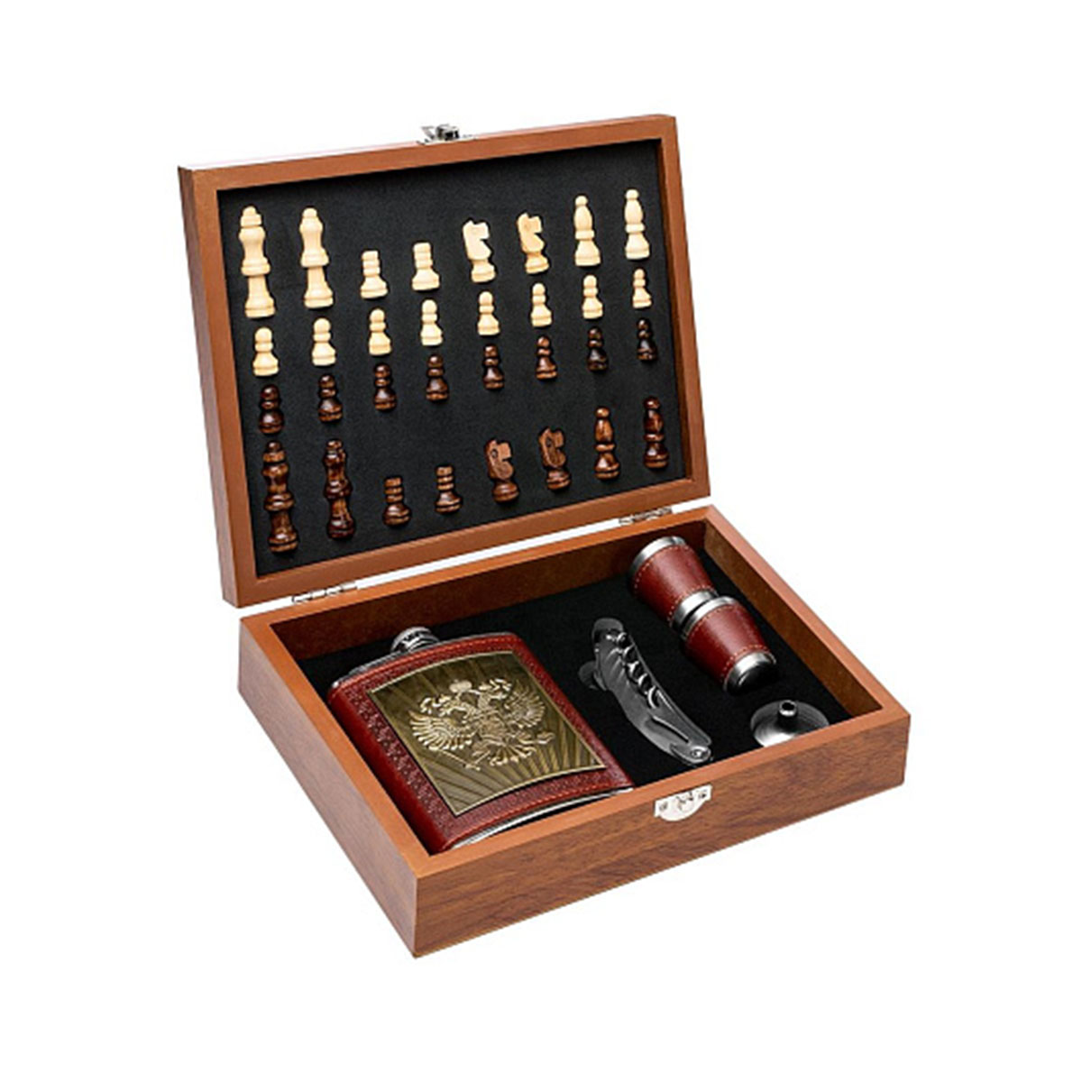 Набор Подарочный Helios с шахматами, в чемодане (фляжка+2 стопки+нож-штопор+воронка) (HS-GT-TZ199)