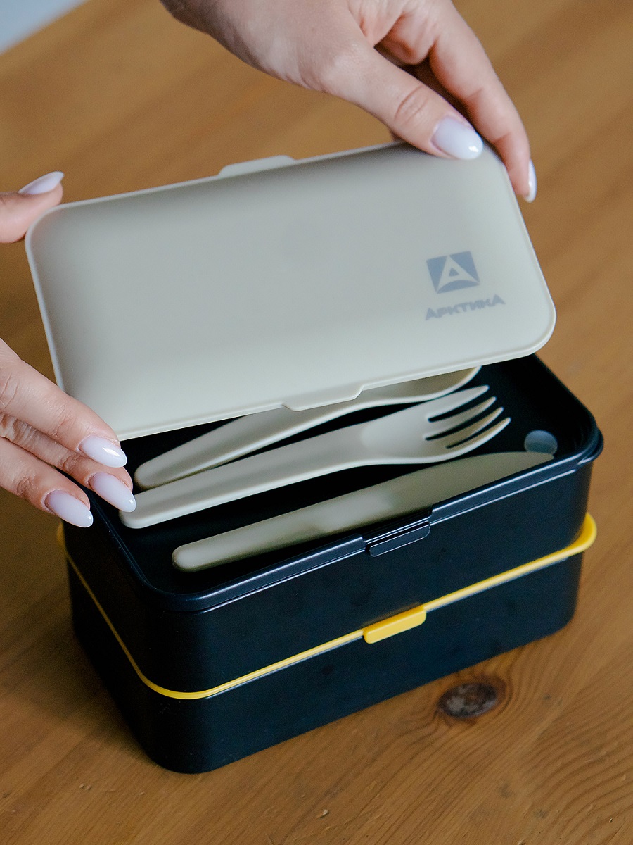 Два отделения по 600 мл с кейсом для ложки, вилки и ножа позволят не смешивать содержимое и его запах, брать с собой горячие блюда и, например, салат. Их можно использовать и отдельно: например, в качестве детского контейнера или бутербродницы, а также для хранения в холодильнике или морозильной камере.