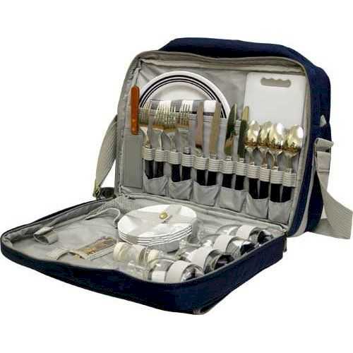 Состав 4 мелкие тарелки, 4 глубокие тарелки, 4 вилки, 4 ложки, 4 ножа, 4 бокала, 4 салфетки, скатерть, солонка, разделочный нож, разделочная доска, штопор, 2 отделения для бутылок, сумка.