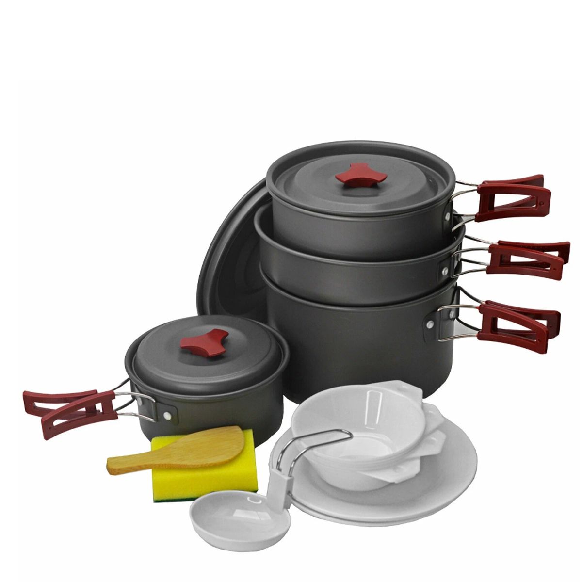 Что входит: три котелка с крышками (19.3×11.5 см; 17.3×9.1 см; 15×7 см), сковорода 19.5×5 см, 5 пиал, 2 тарелки, половник, деревянная лопатка, губка, чехол для хранения. Складные ручки помогают компактно уложить весь комплект в один чехол.