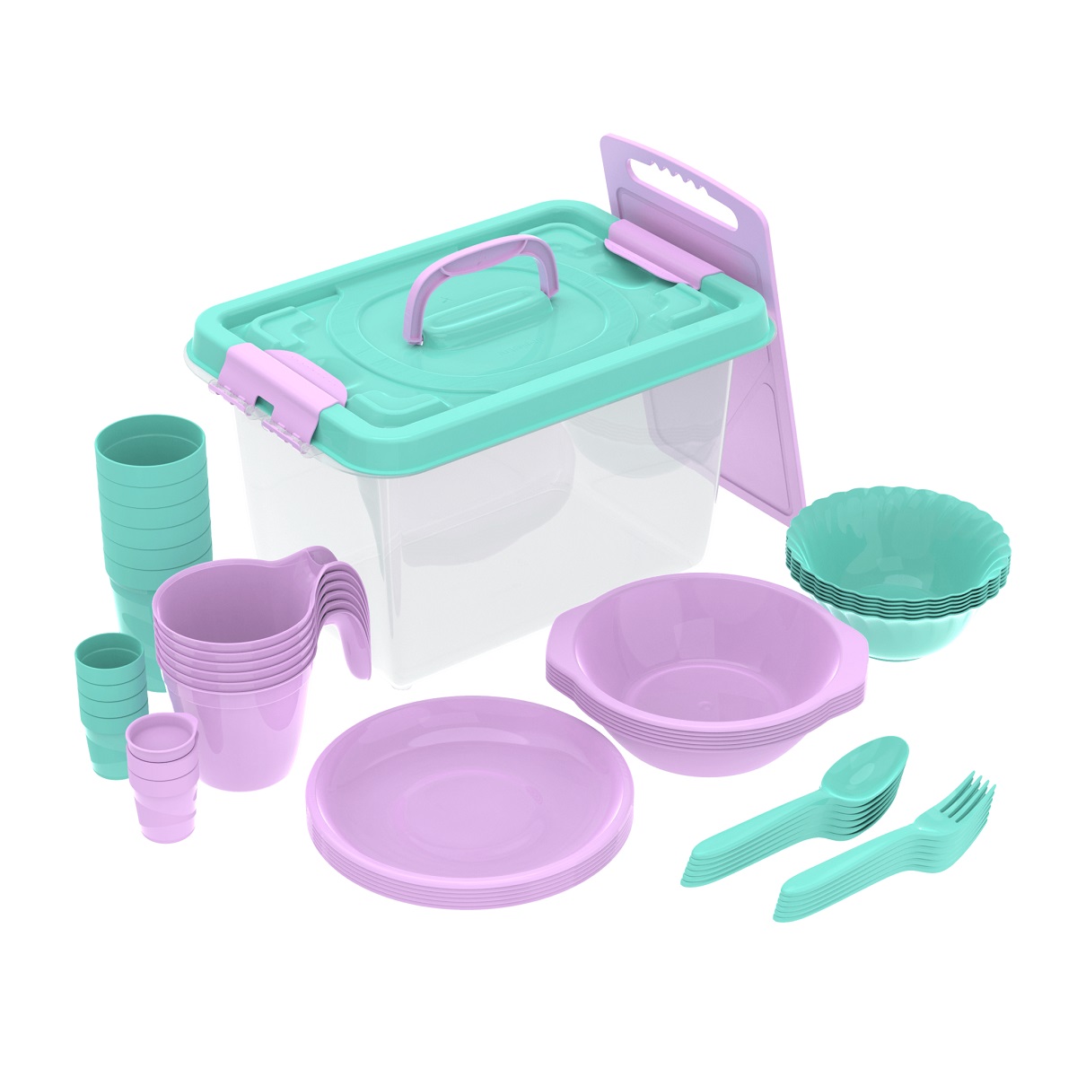 Набор посуды для пикника №17 подходит для компании из шести человек. Набор производим из пищевого пластика, без вредных примесей и Бисфенола А. Вся посуда помещается в бокс. Набор занимает мало места на полке и в багажнике автомобиля.