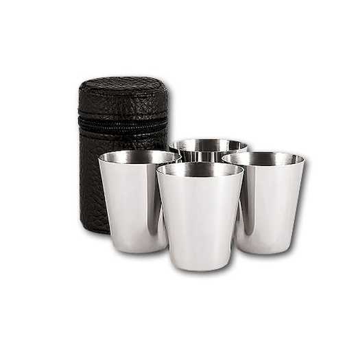 Комплект: 4 рюмки из нержавеющей стали в кожаном футляре.