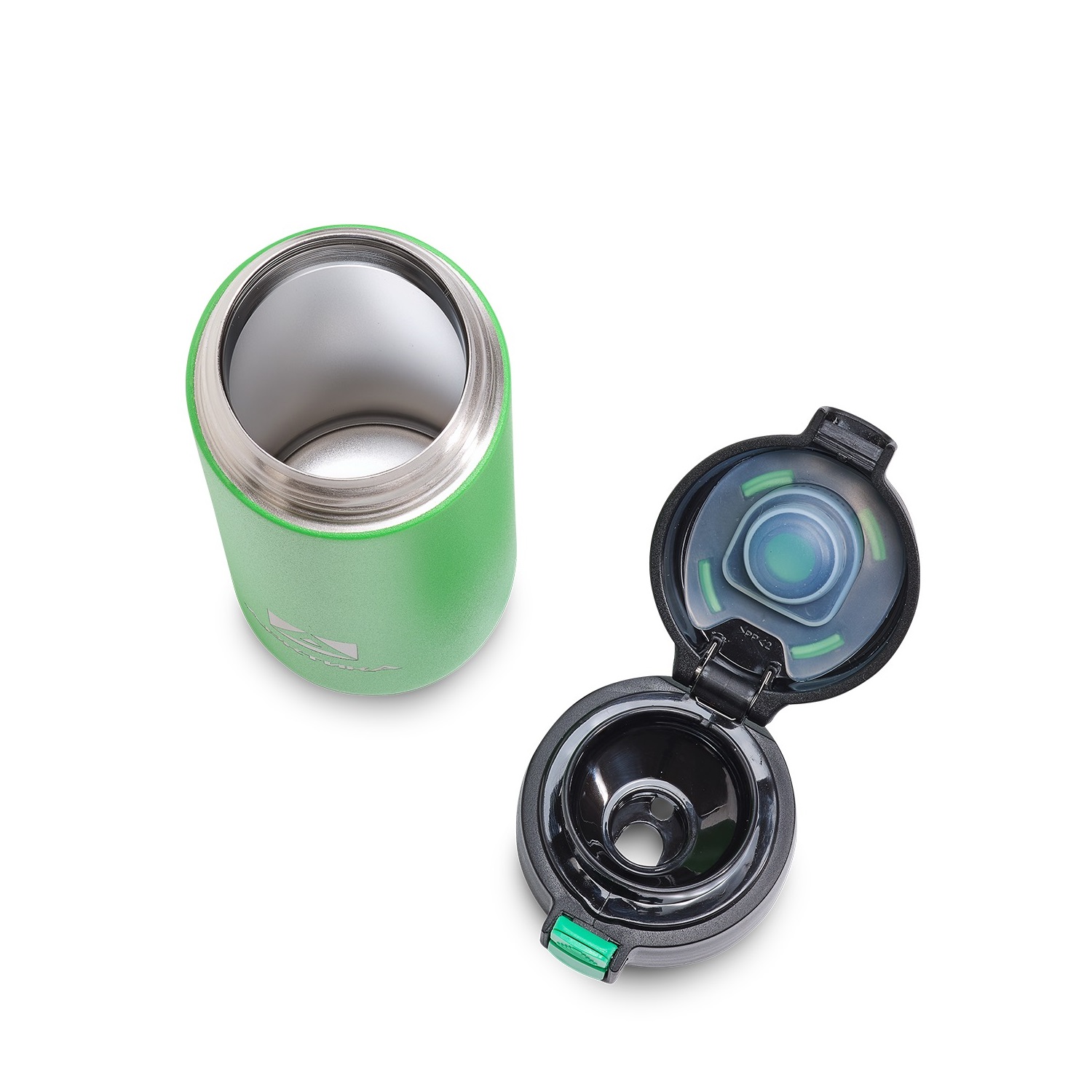 Удобно открывать с помощью кнопки даже одной рукой, так что можно пить на ходу, не теряя ни минуты. При этом фиксатор не даст крышке открыться самостоятельно, а сама крышка полностью закрывает питьевой носик от попадания грязи и пыли. Корпус выполнен из долговечной и прочной нержавеющей стали, питьевая система – из экологичного и безопасного для здоровья пищевого пластика (BPA free).