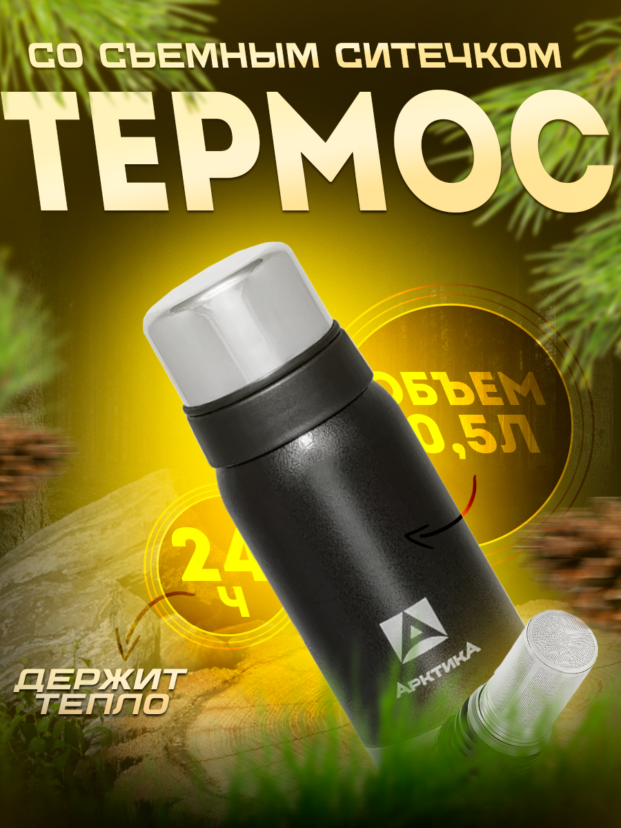 Термос Арктика 106С 500мл с ситечком, узкое горло, черный