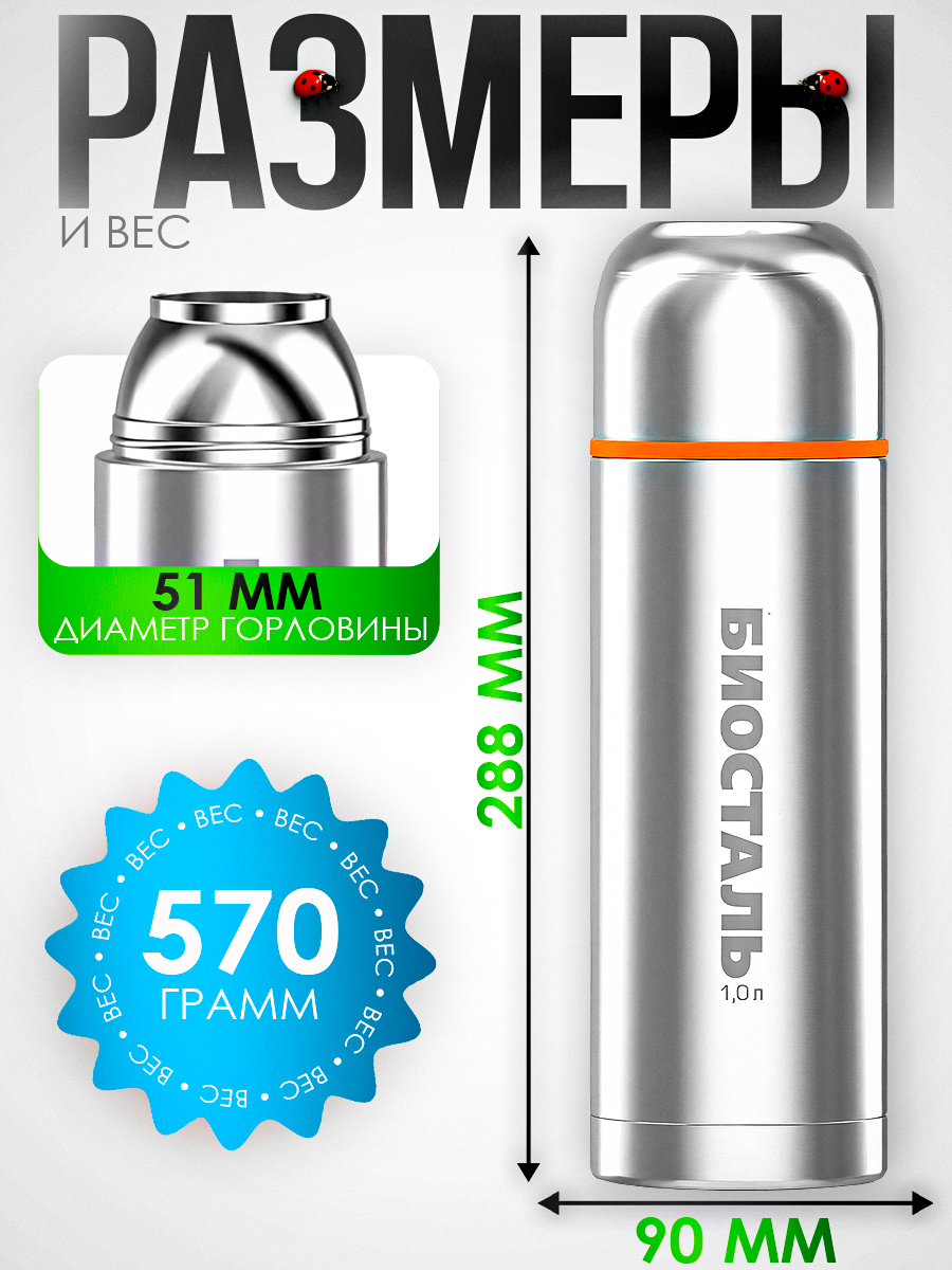 Термос Biostal Спорт NBP-1000 1,0л (узкое горло, 2 чашки)