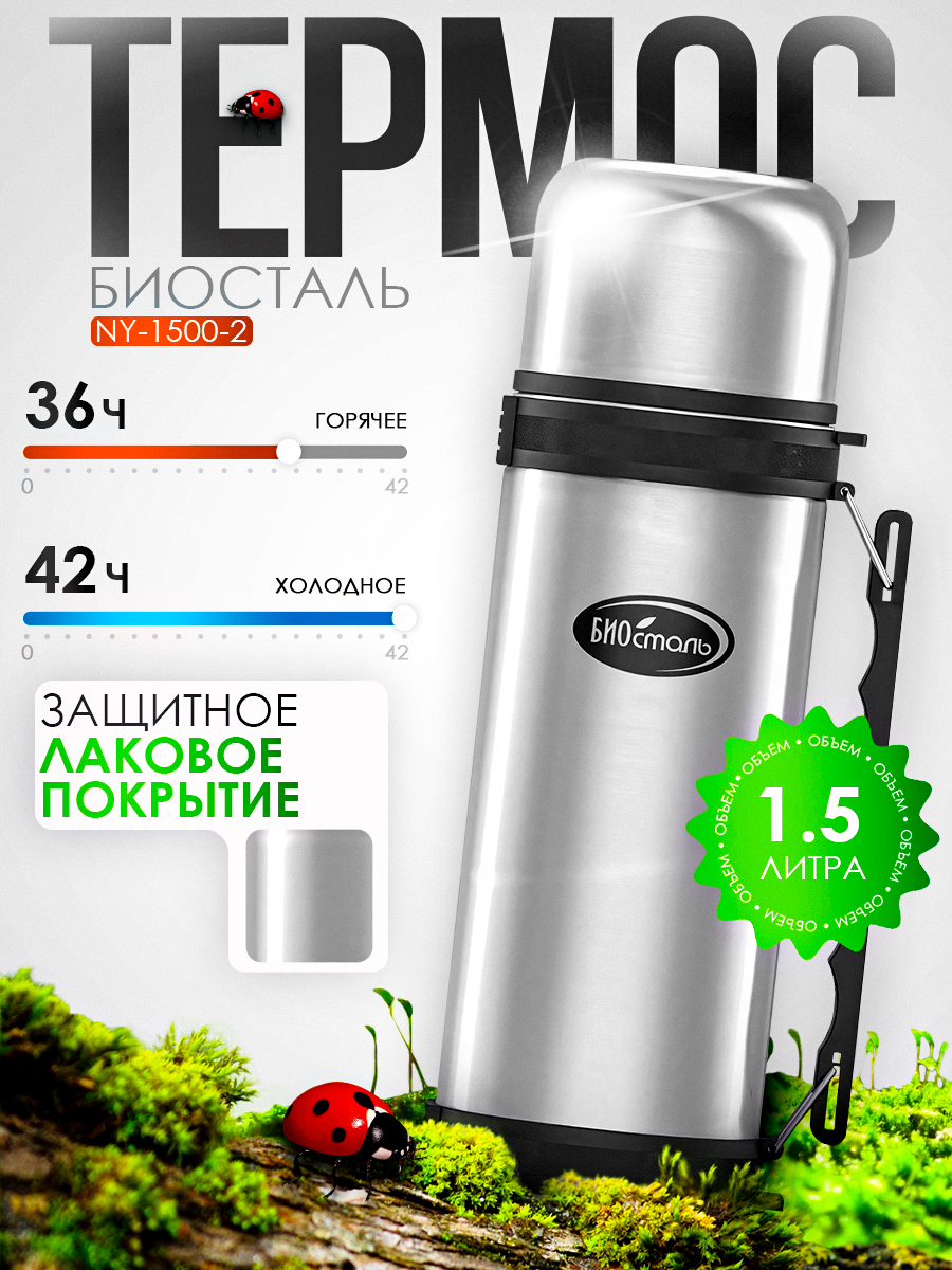 Термос Biostal NY-1500-2 1500мл с ручкой и ремнем, узкое горло