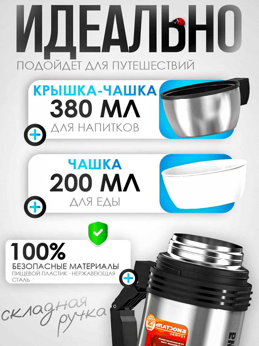 Защитное лаковое покрытие корпуса увеличивает срок эксплуатации и защищает руки от примерзания. Крышка-чашка на 380 мл, дополнительная чашка - 200 мл.