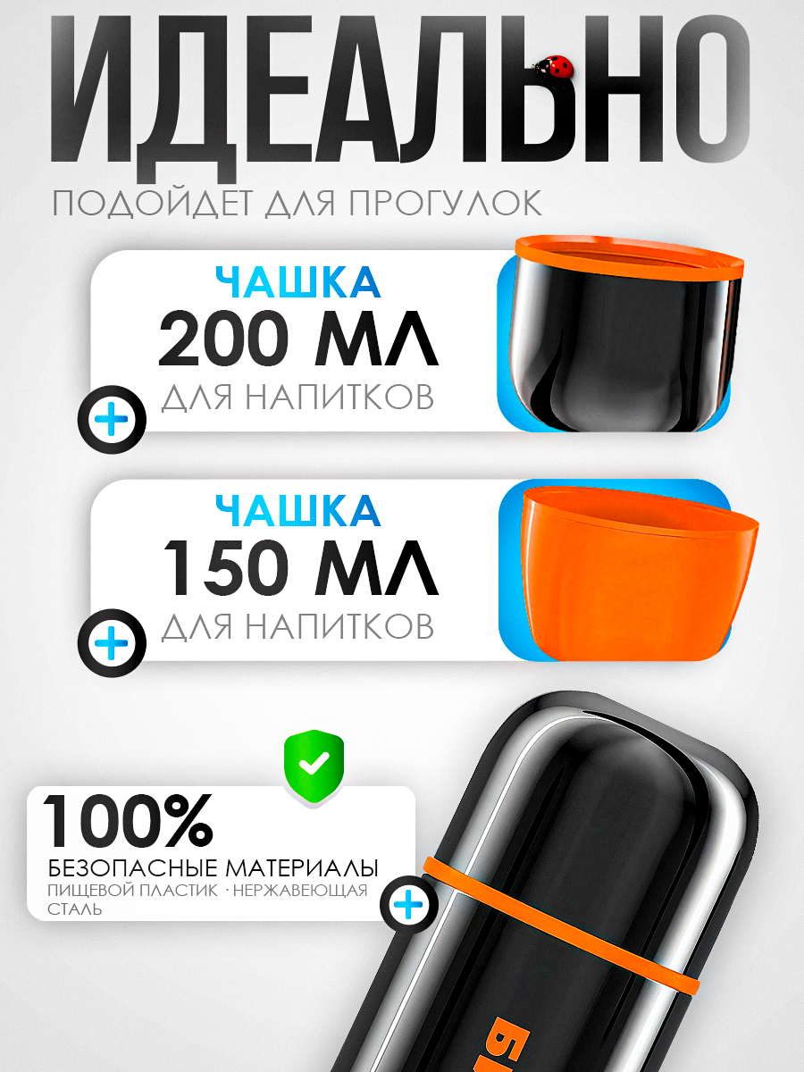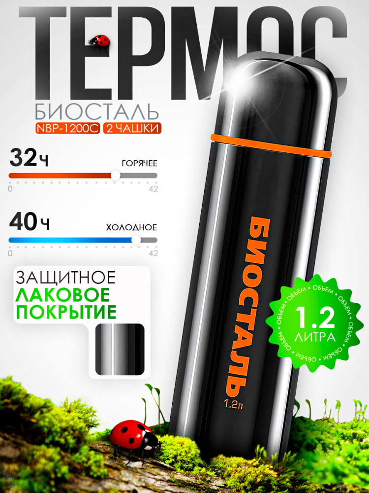 Термос Biostal Спорт NBP-1200C 1,2л (узкое горло, 2 чашки) черный