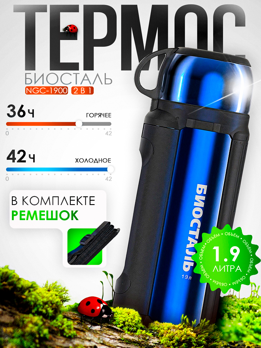 Термос Biostal Авто NGC-1900 1900мл универсальный, с ручкой и ремнем (2 чашки-кружки)