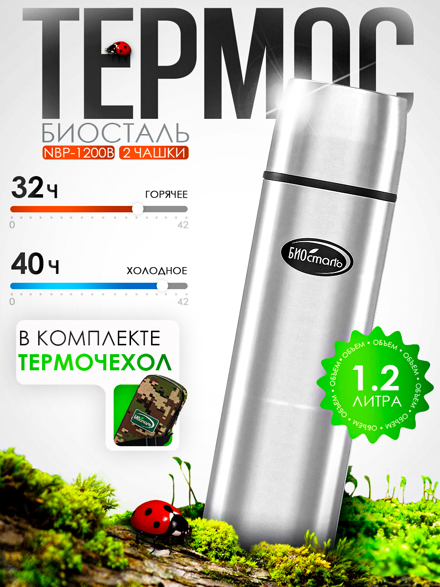 Термос Biostal Охота NBP-1200В 1200мл узкое горло (2 чашки) в чехле