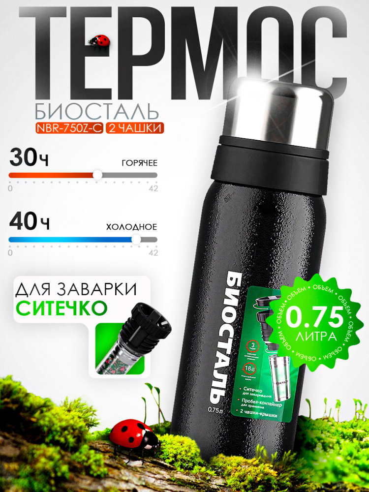 Термос Biostal Охота NBR-750Z-C 0,75л (узкое горло, 2 чашки, пробка с ситечком) черный