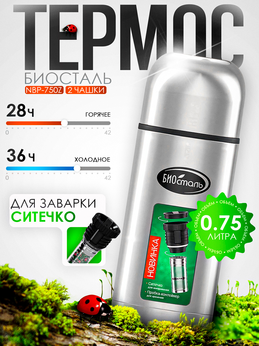 Термос Biostal Охота NBP-750Z 750мл пробка с ситечком, узкое горло (2 чашки)
