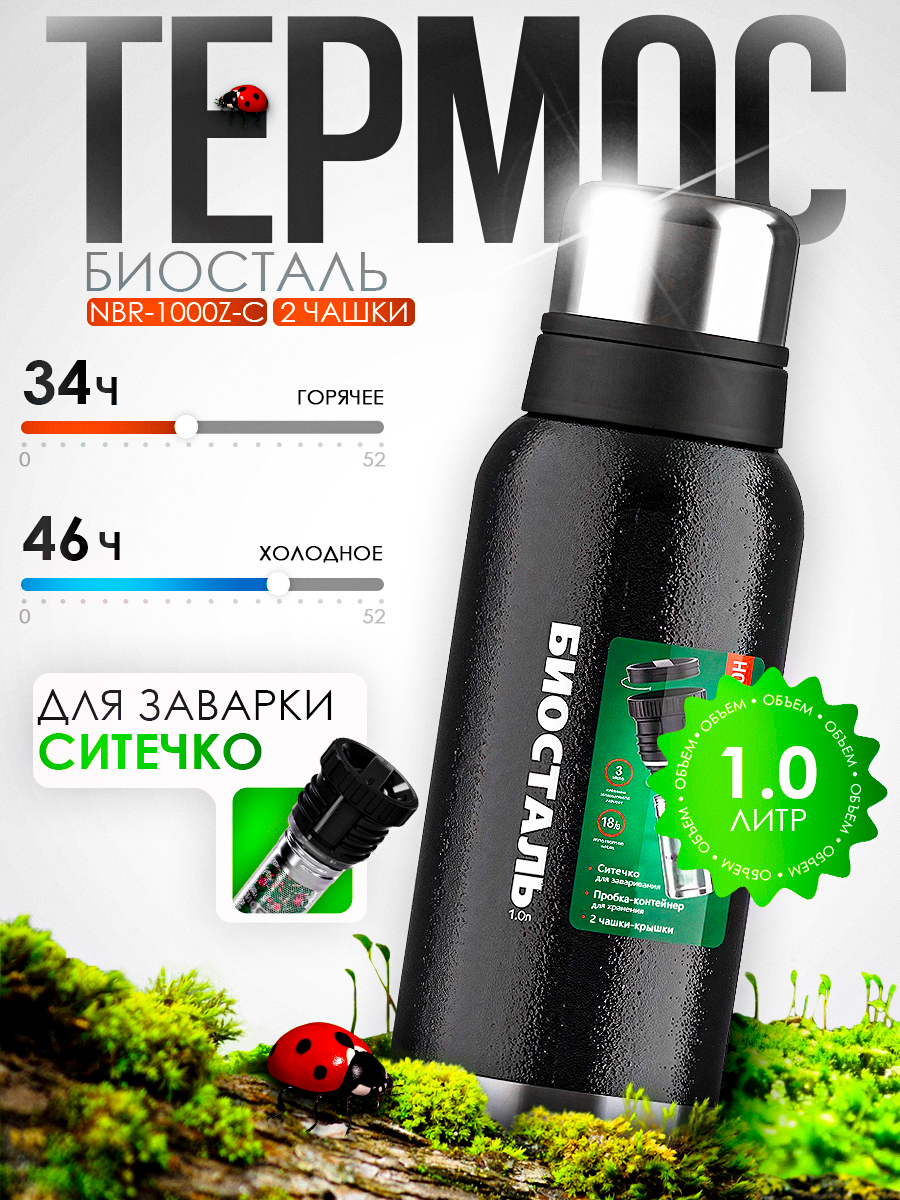 Термос Biostal Охота NBR-1000Z-C 1000мл пробка с ситечком, узкое горло (2 чашки) черный
