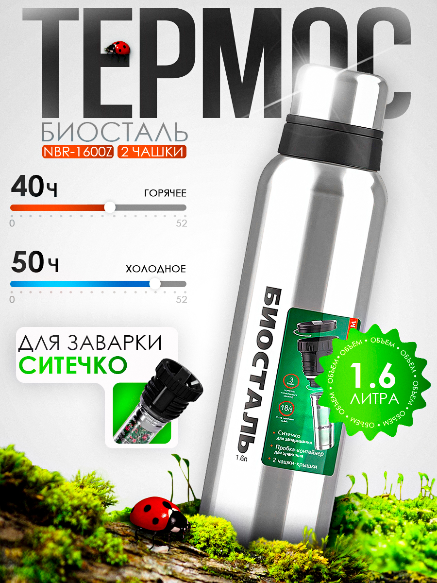 Термос Biostal Охота NBR-1600Z 1600мл пробка с ситечком, узкое горло (2 чашки)