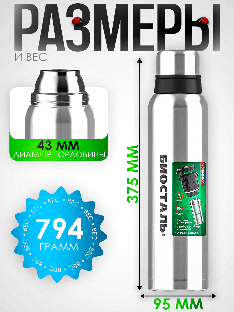 Термос Biostal Охота NBR-1600Z 1,6л (узкое горло, 2 чашки, пробка с ситечком)