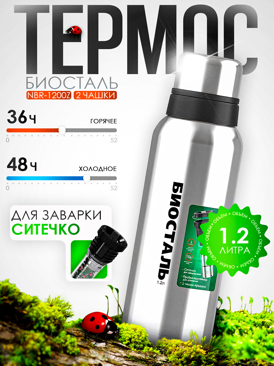 Термос Biostal Охота NBR-1200Z 1200мл пробка с ситечком, узкое горло (2 чашки)