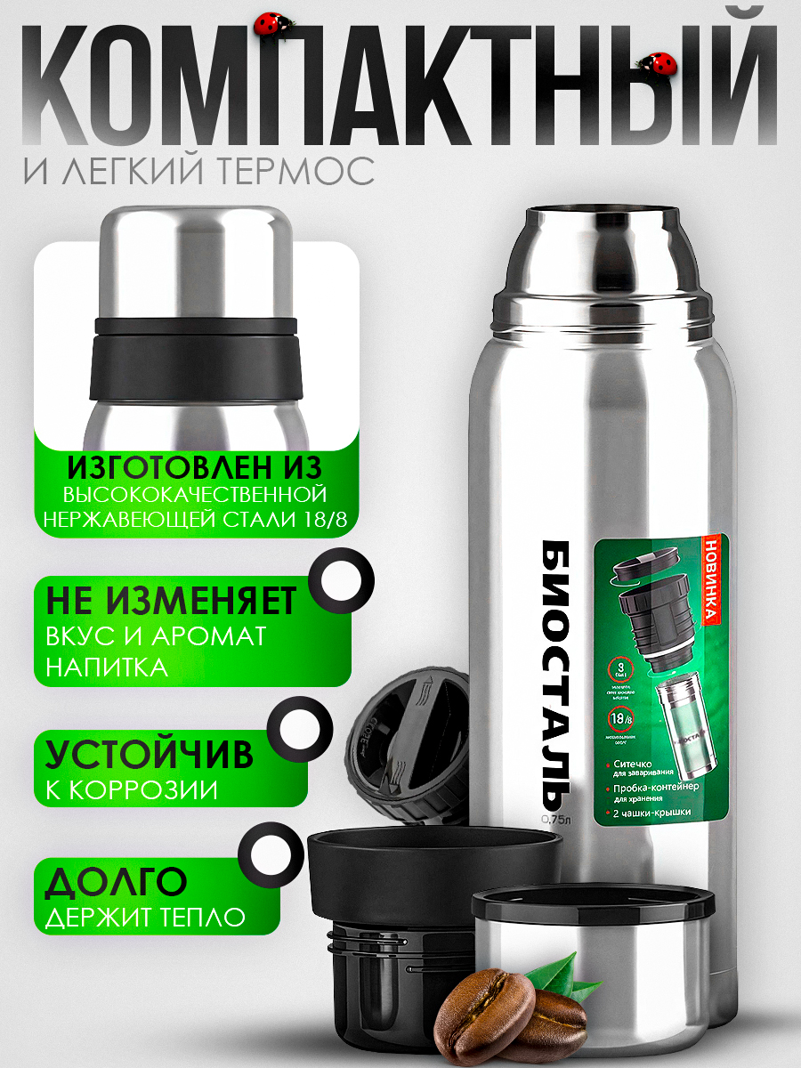 Термос Biostal Охота NBR-750Z 0,75л (узкое горло, 2 чашки, пробка с ситечком)