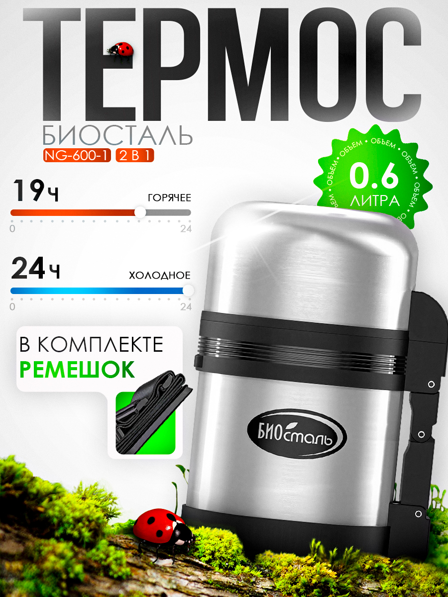 Термос Biostal NG-600-1 600мл универсальный, с ручкой и ремнем (2 чашки-кружки)