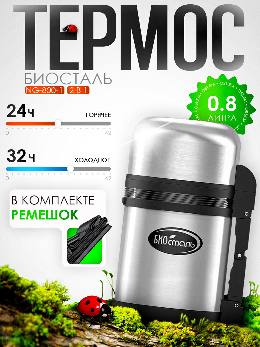 Термос Biostal NG-800-1 800мл универсальный, с ручкой и ремнем (2 чашки-кружки)