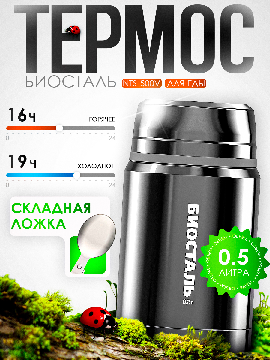 Термос Biostal NTS-500V 500мл для еды, с ложкой, широкое горло, вороненая сталь