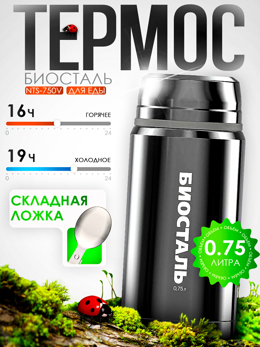 Термос Biostal NTS-750V 750мл для еды, с ложкой, широкое горло, вороненая сталь