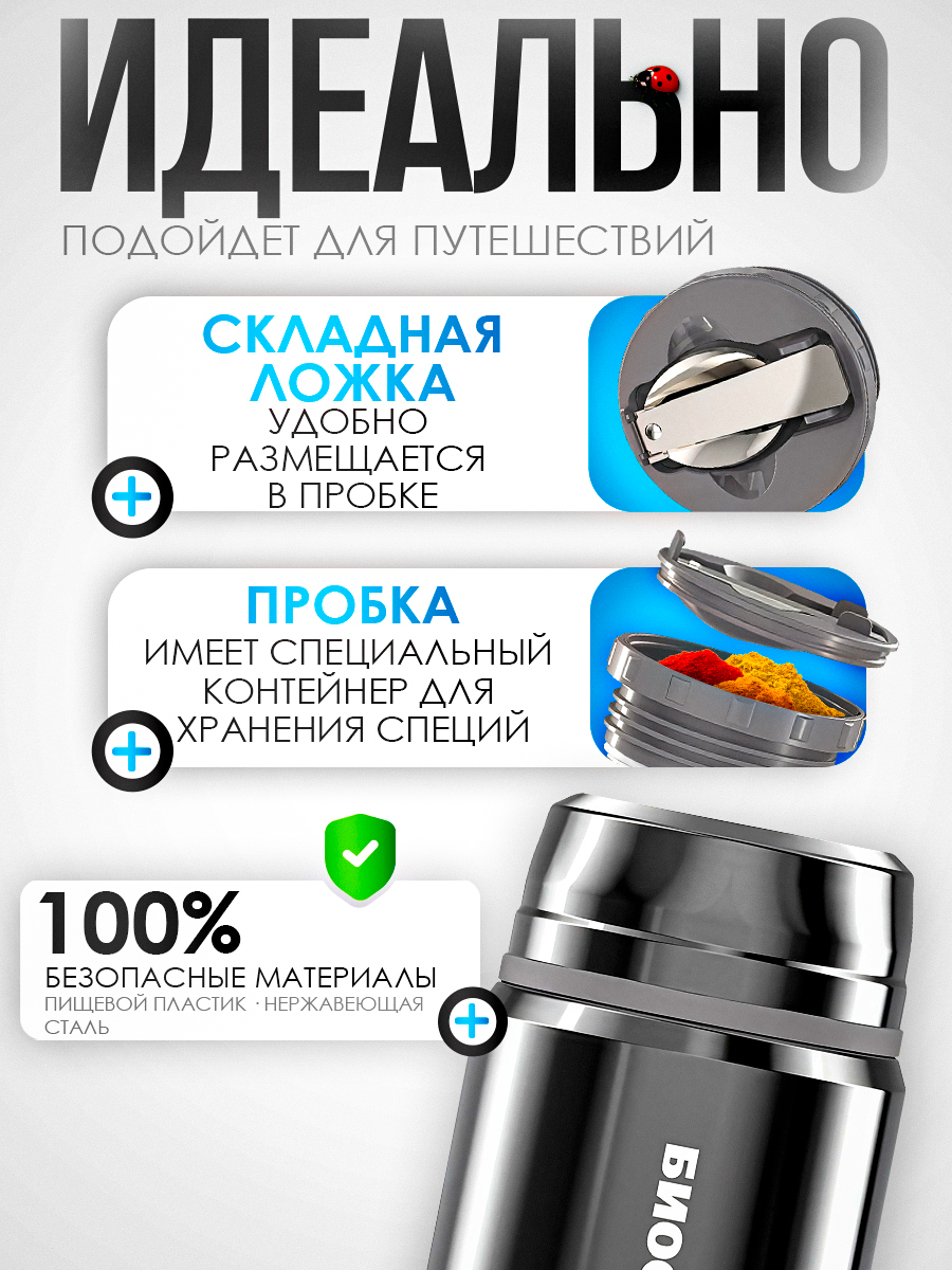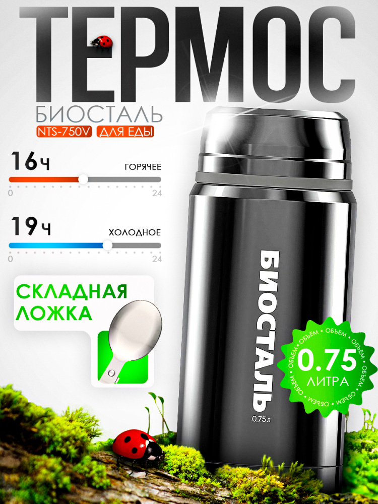 Термос Biostal NTS-750V 0,75л (широкое горло, ложка) цвет вороненая сталь