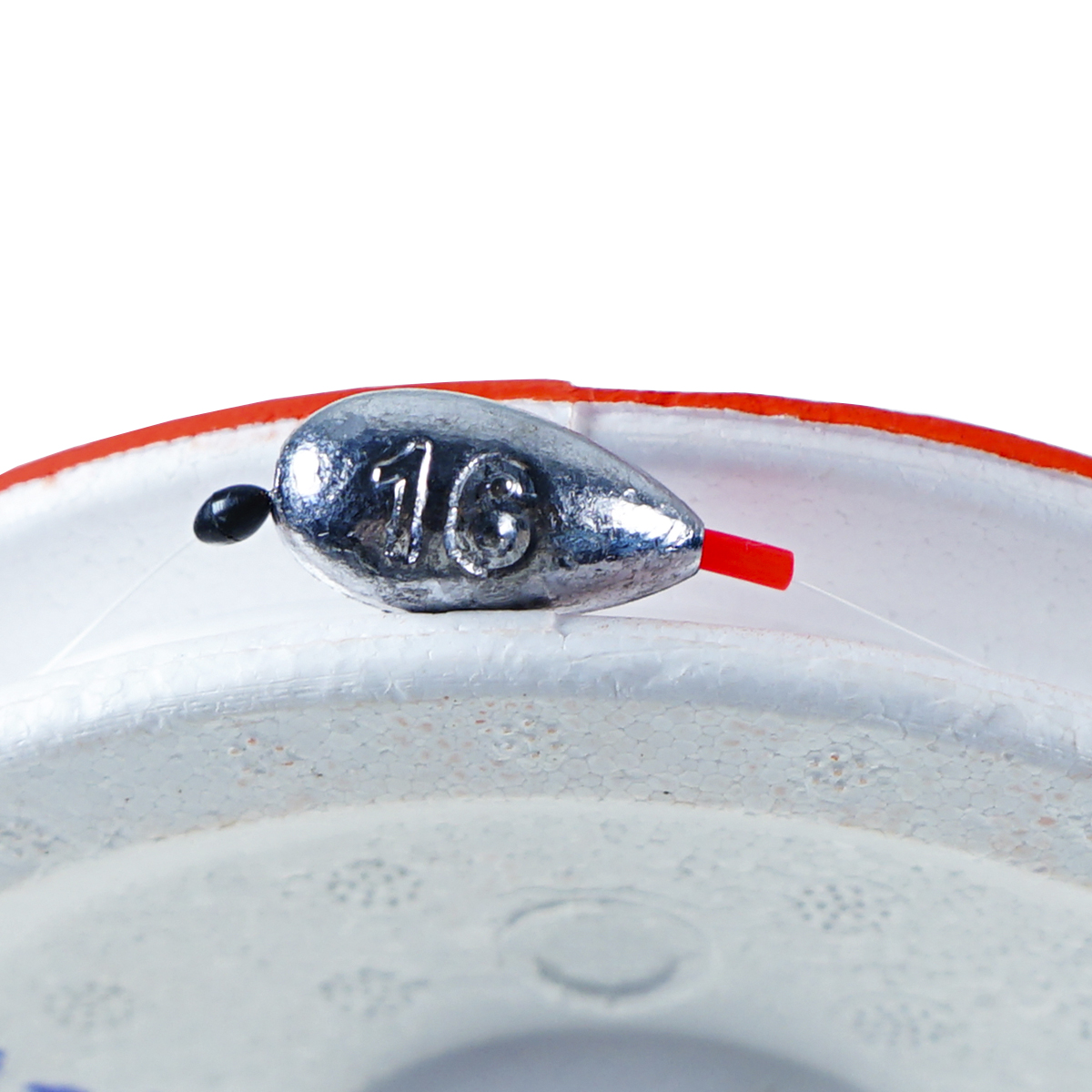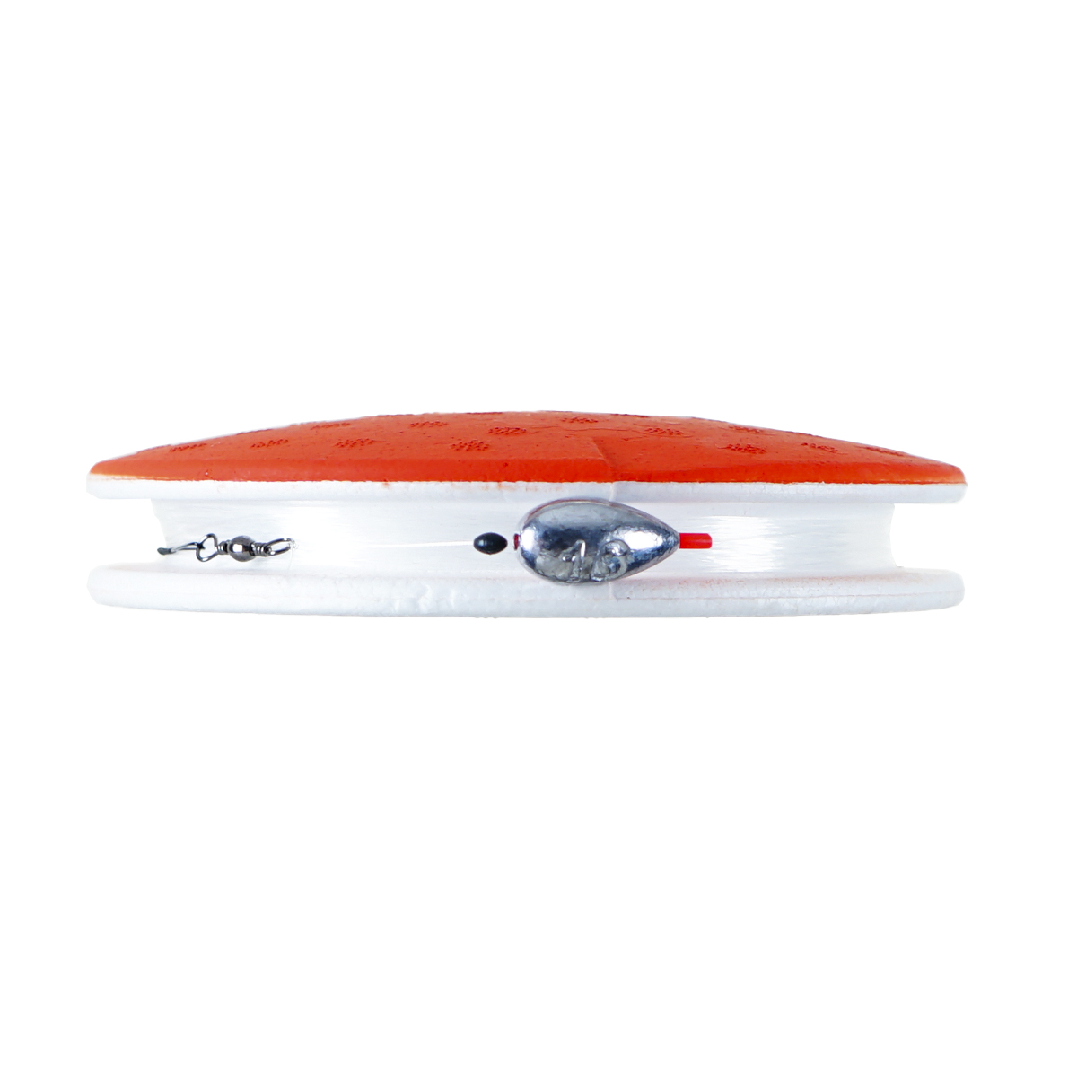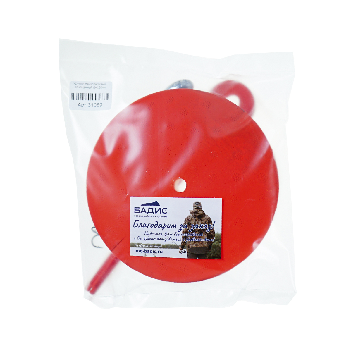 Кружок изготовлен из прочного прессованного пенопласта. Для заметности верхняя часть кружка окрашена в красный цвет. В центре предусмотрено отверстие под снимаемый пластиковый штырь. По периметру кружка расположен желобок, который служит для укладки лески.