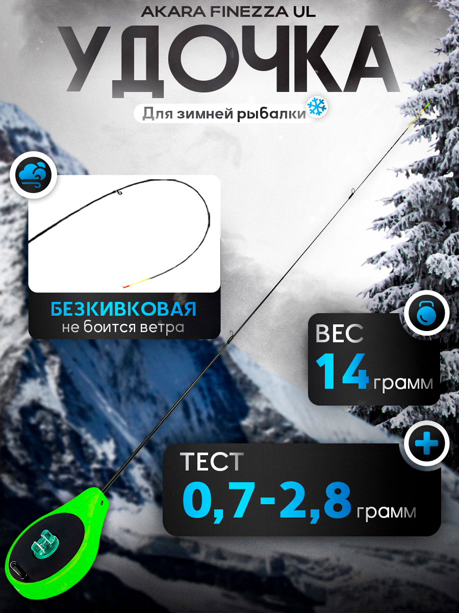 Удочка зимняя Akara Finezza UL безкивковая 35см 0,7-2,8гр балалайка, с кольцами, хлыст стеклопластик, зеленая