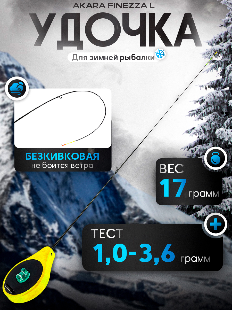 Удочка зимняя Akara Finezza L безкивковая 35см 1-3,6гр балалайка, с кольцами, хлыст стеклопластик, желтая