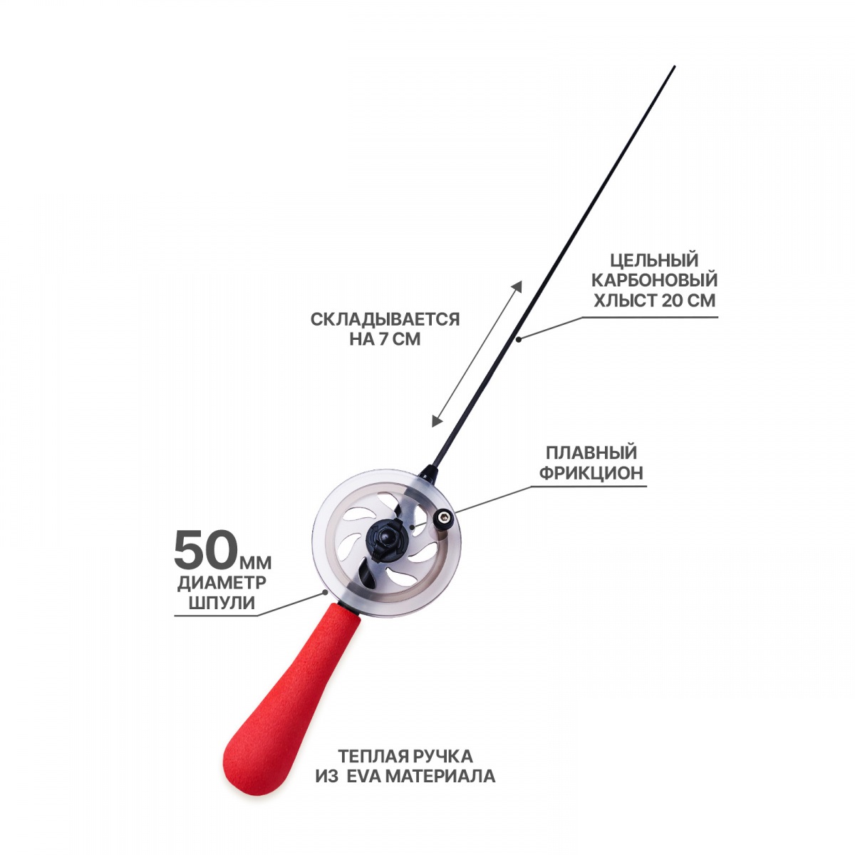 Вес удочки 15 грамм, шпуля 50 мм, шестик 200мм. Длинна 320мм, длинна в сложенном состоянии 250мм.